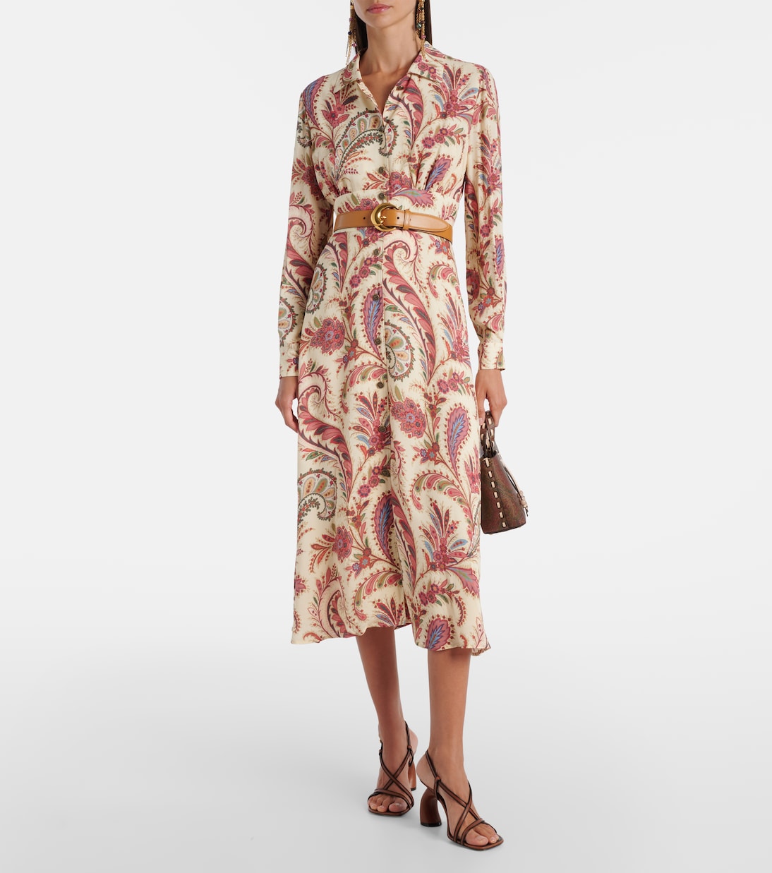 Принты пейсли настолько прочно ассоциируются с Etro, что стали визитной карточкой этого дома. Это платье-рубашка скроено по силуэту миди с застежкой на пуговицы спереди и расклешенной юбкой, которая добавляет объема и движения.