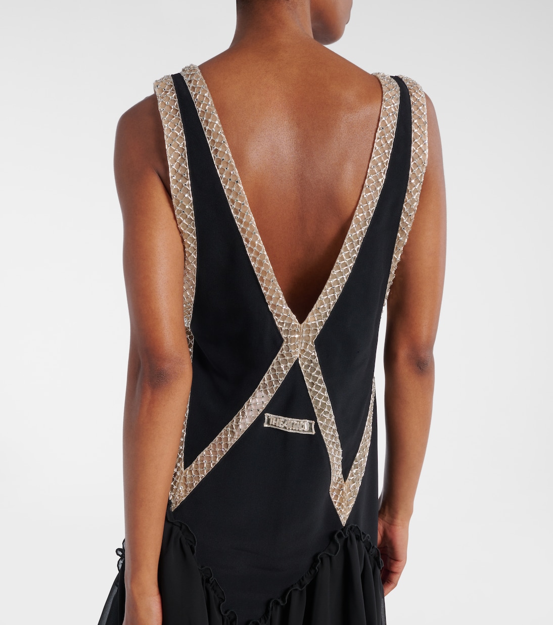 Пришло время нарядиться в это мини-платье от The Attico, сшитое в Италии из воздушного жоржета. Этот стильный дизайн отличается глубоким V-образным вырезом и сетчатой вышивкой, что придает ему шикарный, гламурный вид.