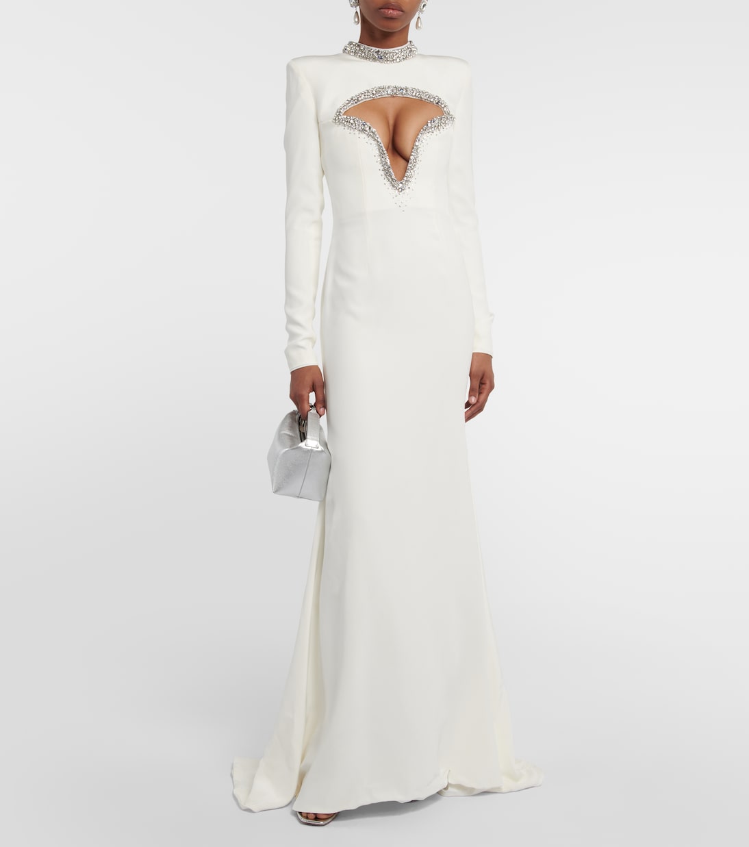 Произведения от мисс Сохи сочетают в себе вдохновляющие пейзажи причудливой фантазии и современную королевскую роскошь. Это платье из чистого шелка не является исключением благодаря своим длинным рукавам, вырезу спереди, украшенному кристаллами, и силуэту до пола.