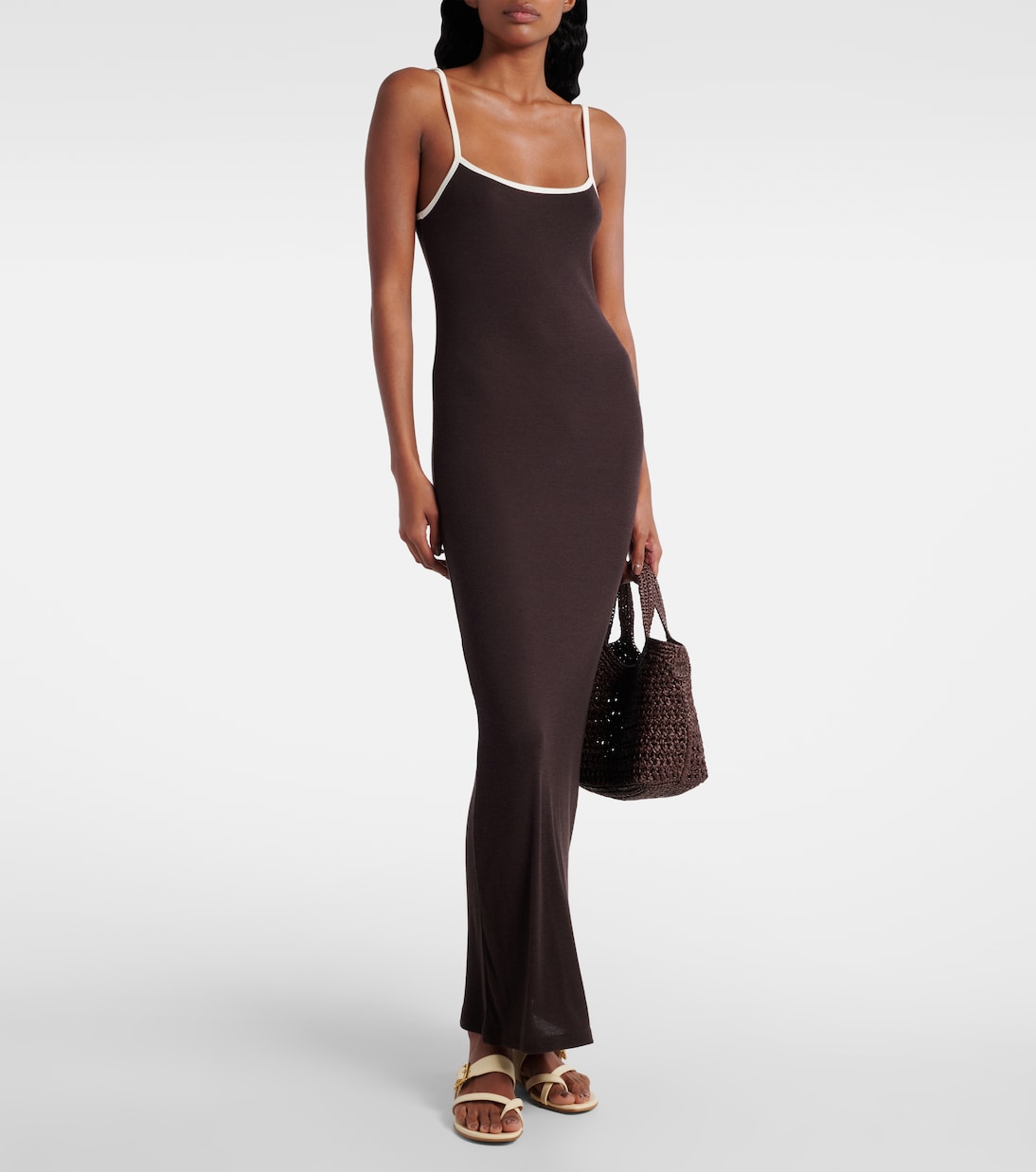 Разработанный в Лос-Анджелесе, бренд Aya Muse зарекомендовал себя как место, где можно приобрести эксклюзивные базовые вещи и яркие вечерние наряды. Это минималистичное платье-комбинация из эластичного трикотажа дополнено игривой контрастной отделкой.