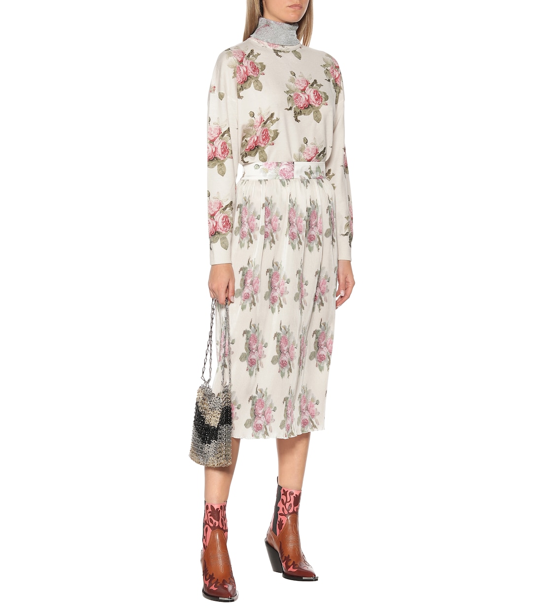 Расцветите в этой юбке с цветочным принтом от Paco Rabanne. Изящный фасон миди выполнен в приглушенном цвете слоновой кости, что позволяет акцентировать внимание на розовых букетах. Дополните свой образ подходящими мюлями и укороченным белым свитером, чтобы создать эффектный образ для садовой вечеринки.