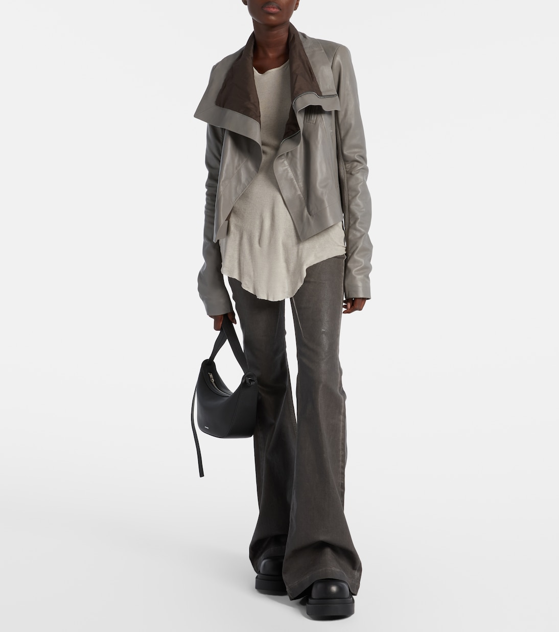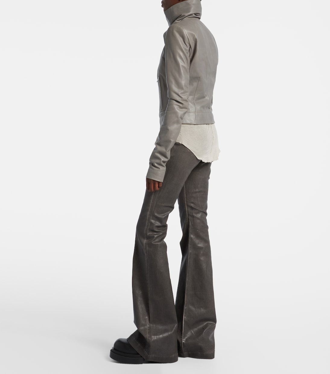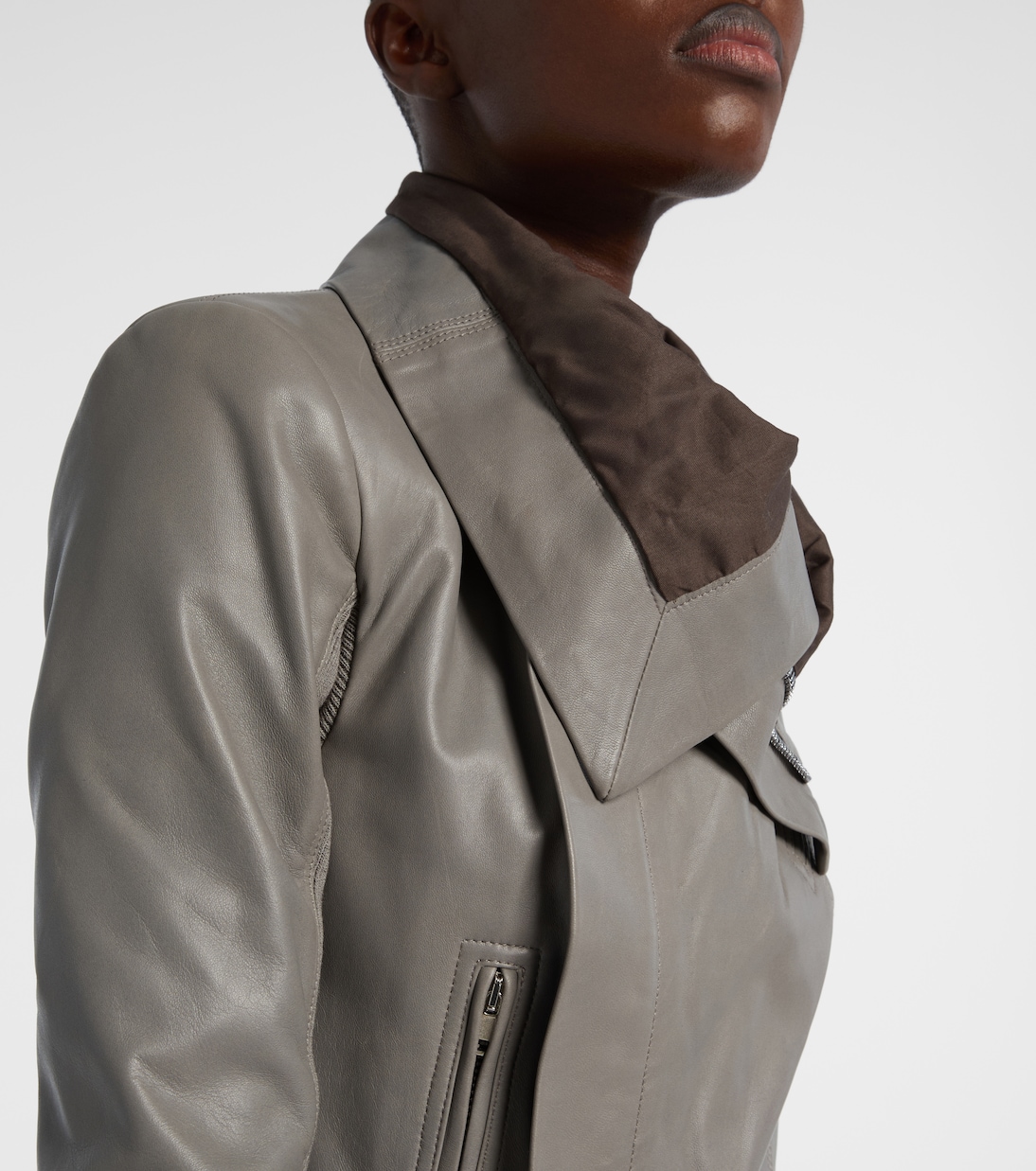 Рик Оуэнс, которого метко прозвали Властелином тьмы, привносит готическое и индустриальное вдохновение в авангардный дизайн. Изготовленная из невероятно мягкой кожи, эта серая куртка имеет высокий воротник и смещенную застежку.