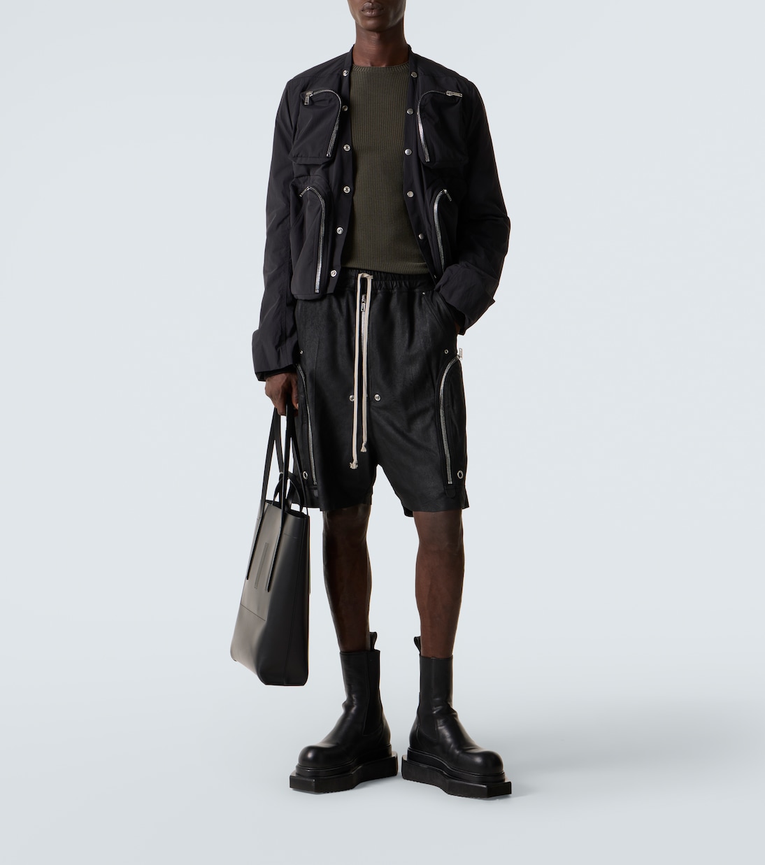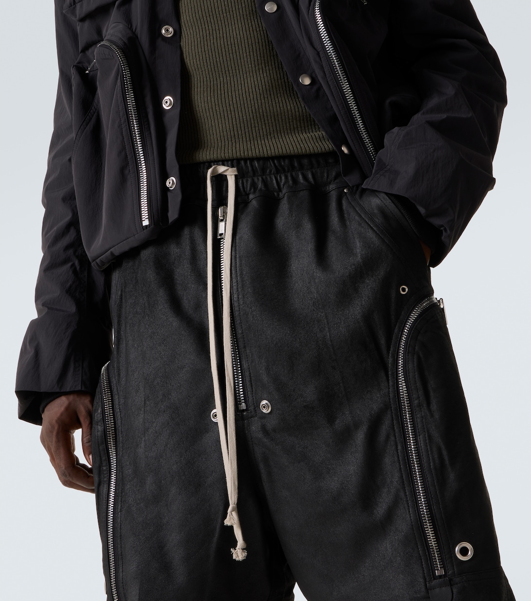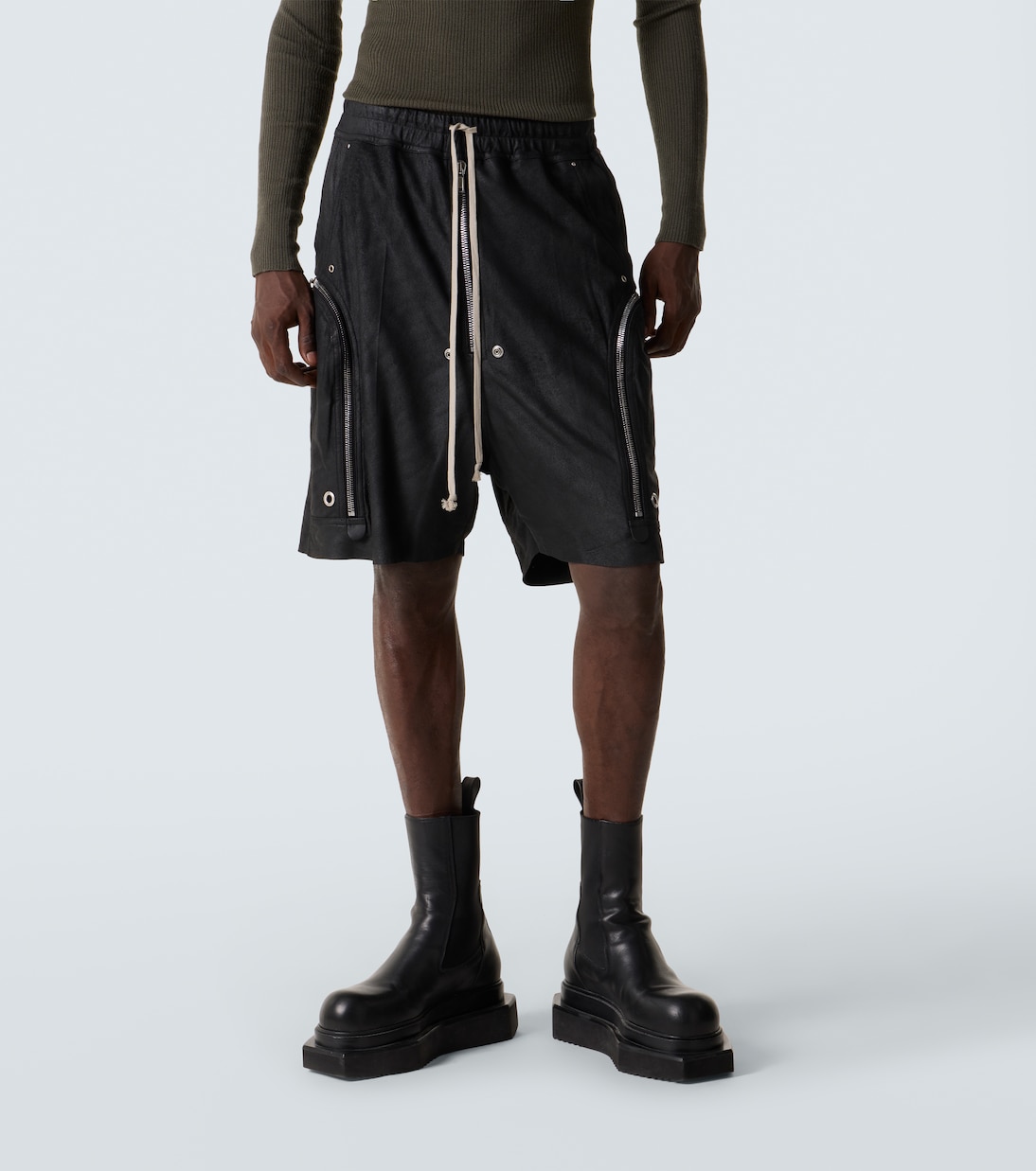 Рик Оуэнс, которого метко прозвали Властелином тьмы, привносит готическое и индустриальное вдохновение в авангардный дизайн. Шорты Bauhaus Bela изготовлены из кожи и застегиваются на молнию, а талия на резинке со шнурком.