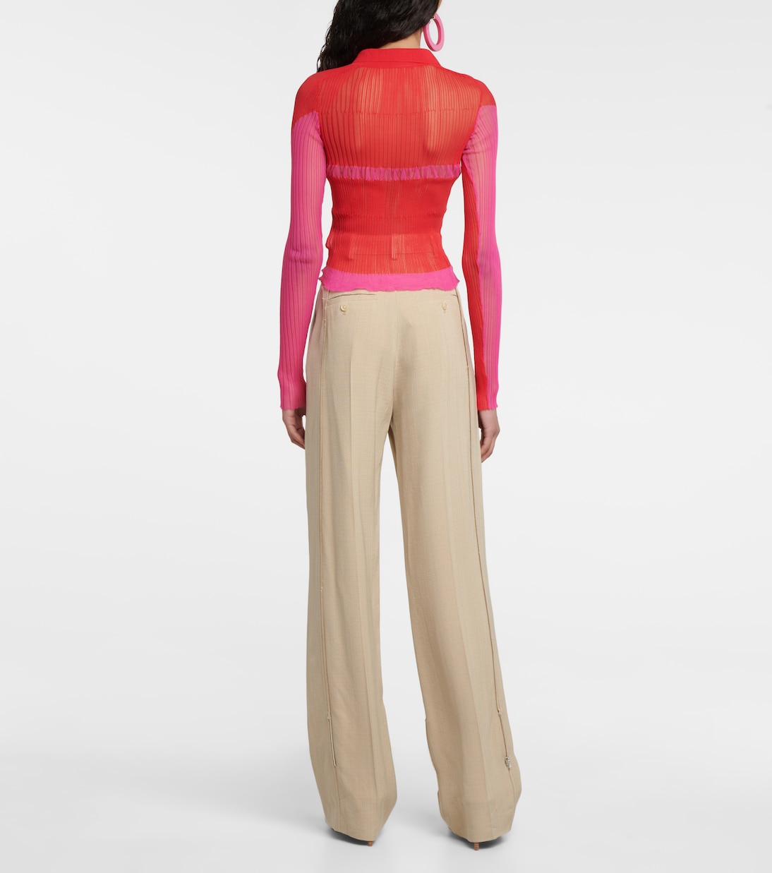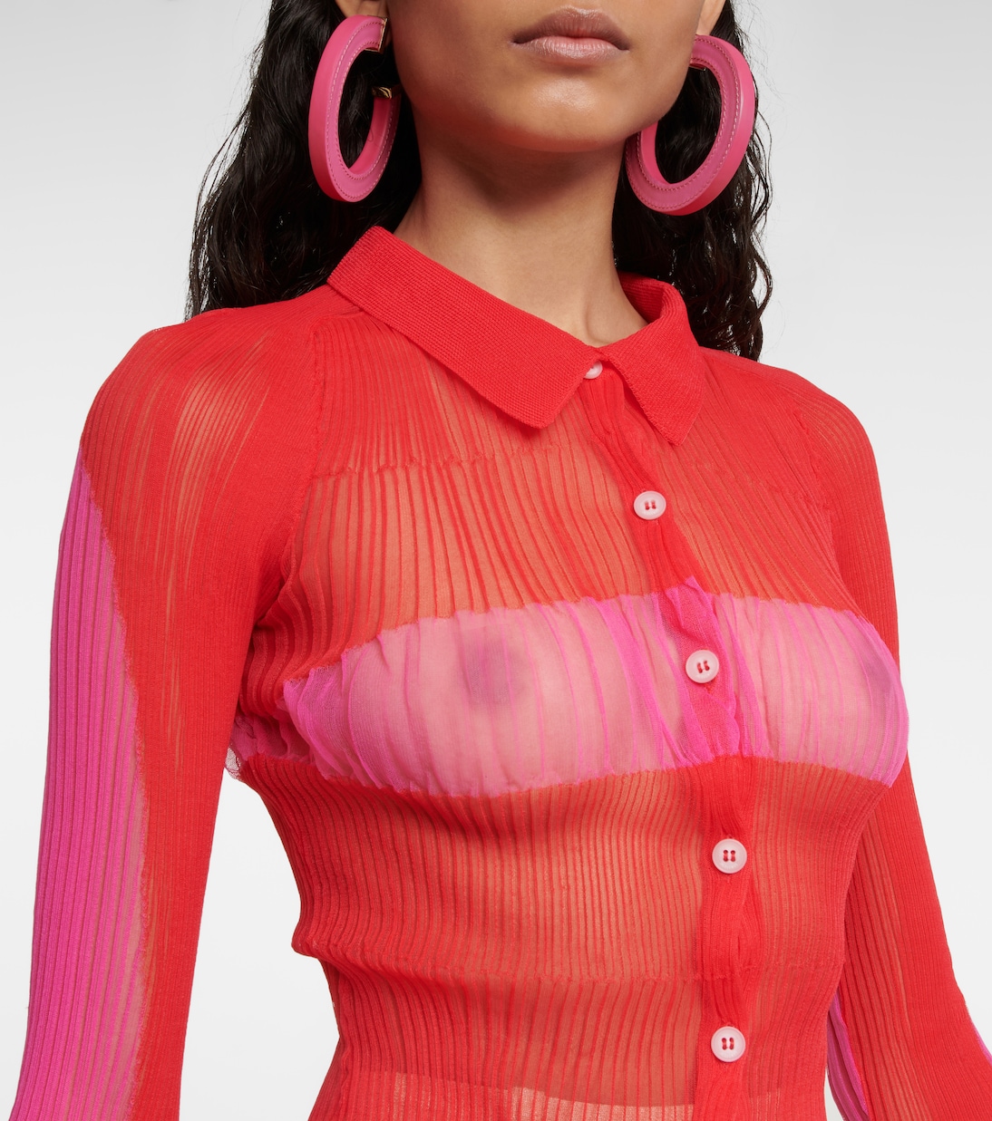 Рубашка La Chemise Maille Sognu от Jacquemus добавит нотку смелого очарования вашим вечерним образам. Изготовленный из прозрачной плиссированной ткани, облегающий фасон отличается контрастными плиссированными полосками и переливающимися пуговицами.