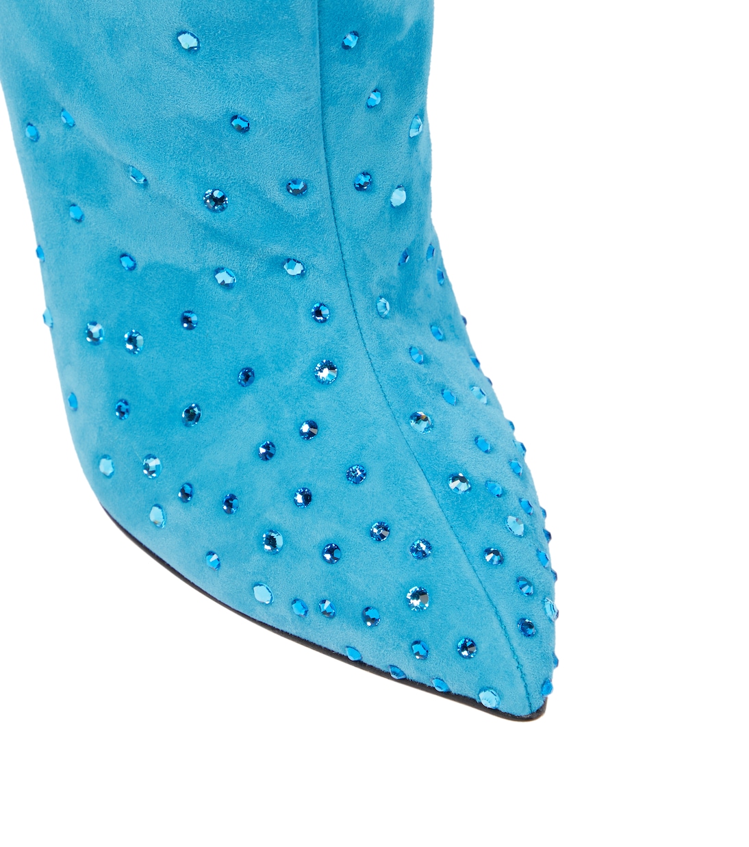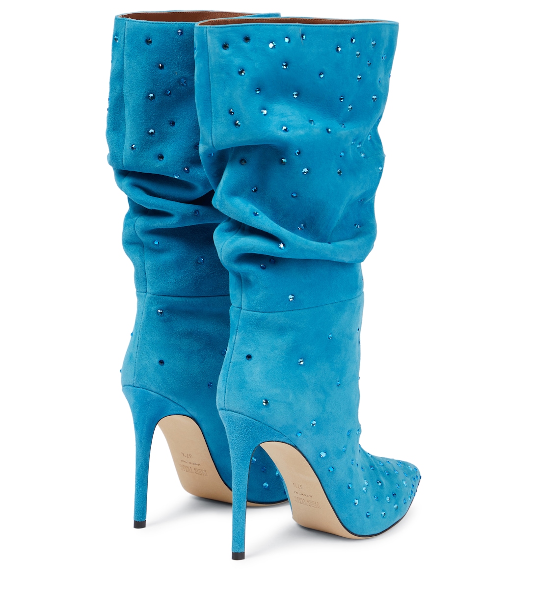 Сапоги Holly из синей замши длиной до середины голени украшены сверкающими кристаллами и установлены на каблуках-шпильках высотой 105 мм. У них объемные голенища, ключевая особенность дизайна итальянских обувщиков Paris Texas.