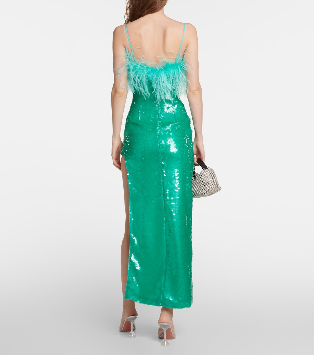 Сверкайте и блистайте на вашем следующем мероприятии в этом платье миди от Giuseppe di Morabito. Этот облегающий фасон, полностью украшенный ослепительными пайетками, отличается соблазнительным боковым разрезом до бедра, тонкими бретельками и эффектной отделкой из перьев.