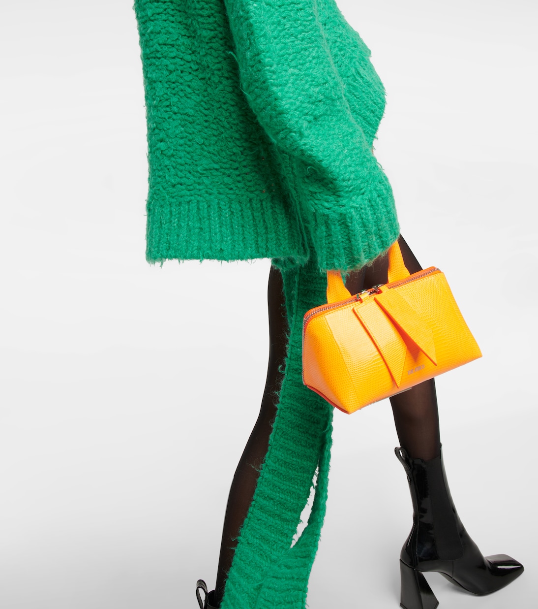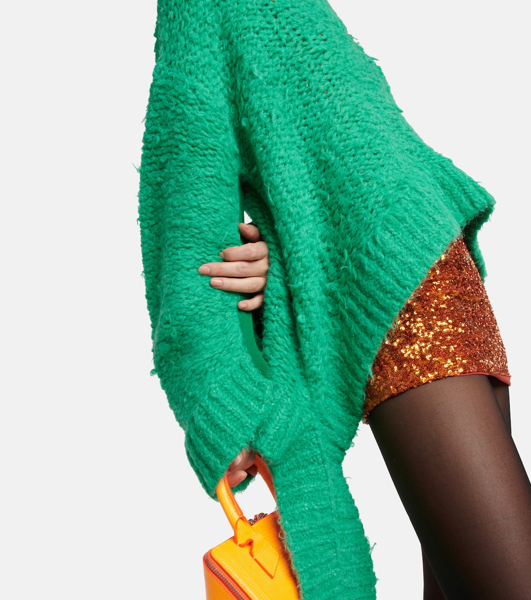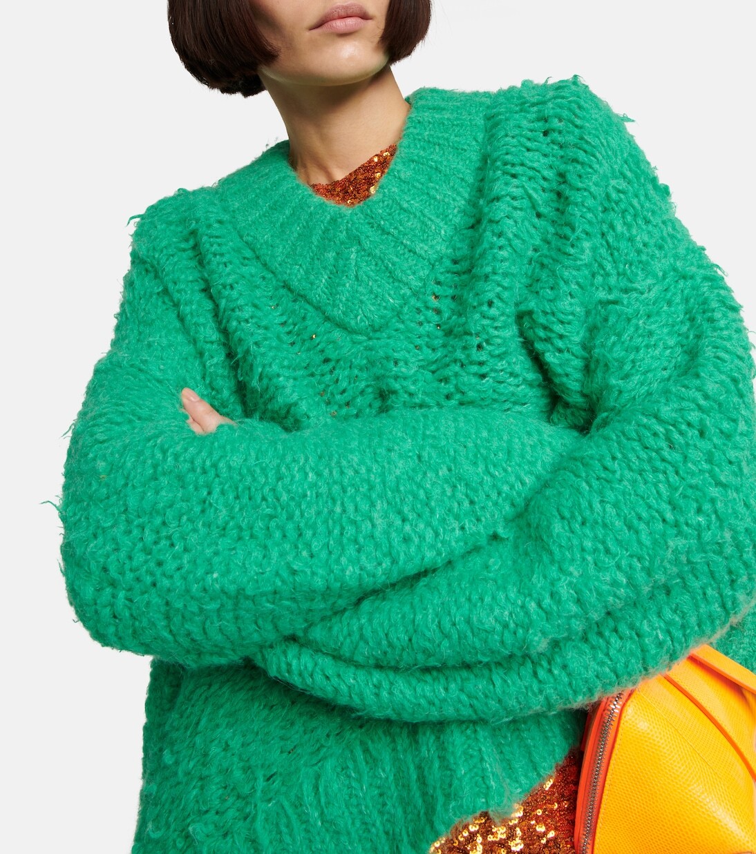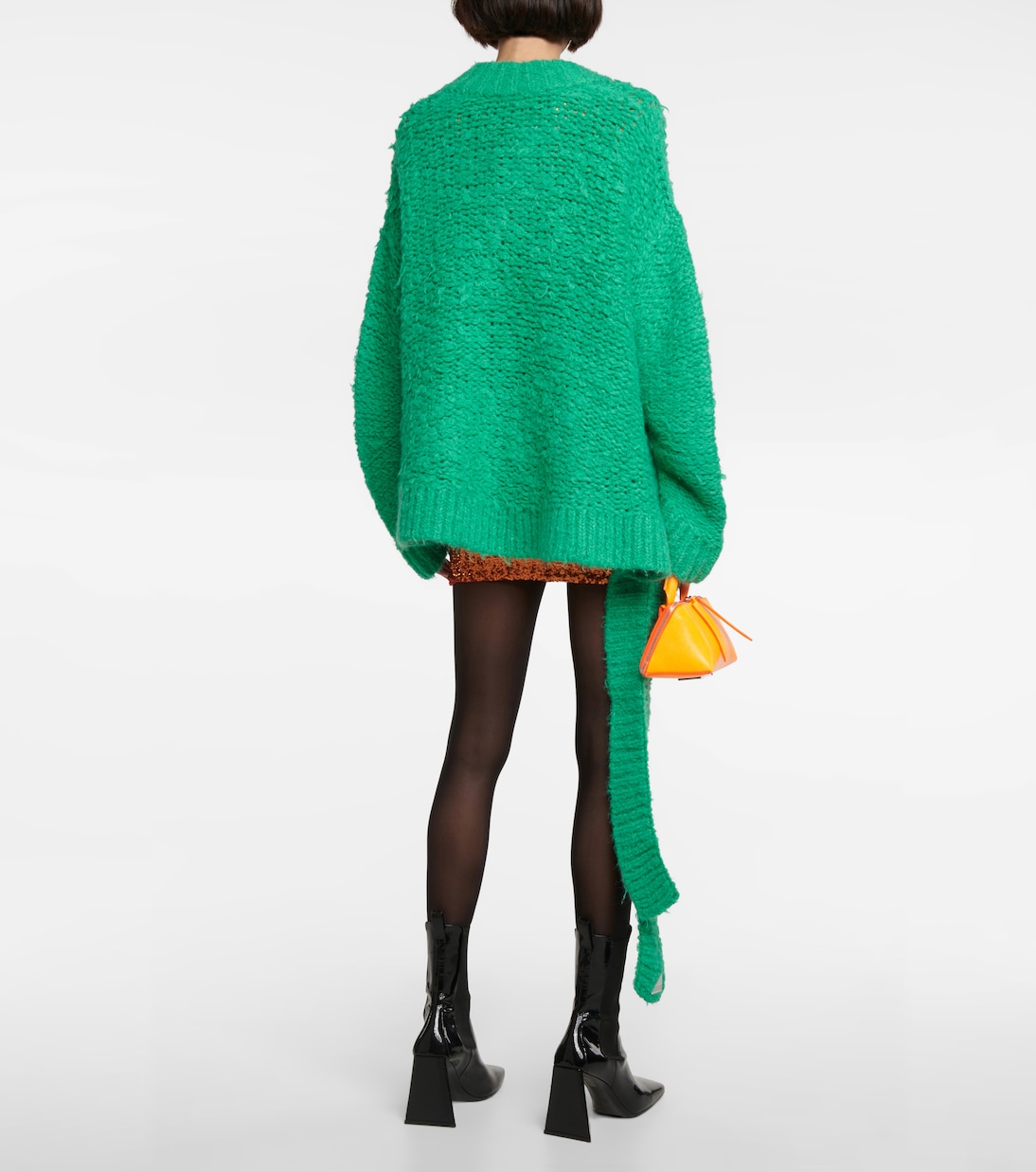 Свитер Ruth от The Attico, изготовленный из смеси альпаки, отличается спущенными плечами, свободным кроем, V-образным вырезом и ребристыми отделками, переходящими в подвеску на подоле.