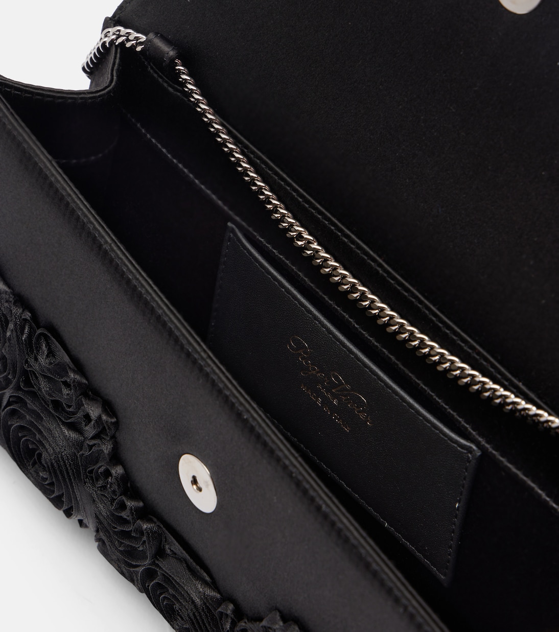 Сделанная в Италии атласная сумочка-клатч Roger Vivier Envelope имеет структурированную форму, магнитную застежку и съемный плечевой ремень-цепочку. Дизайн дополнен фирменным украшением из кристаллов на переднем клапане.