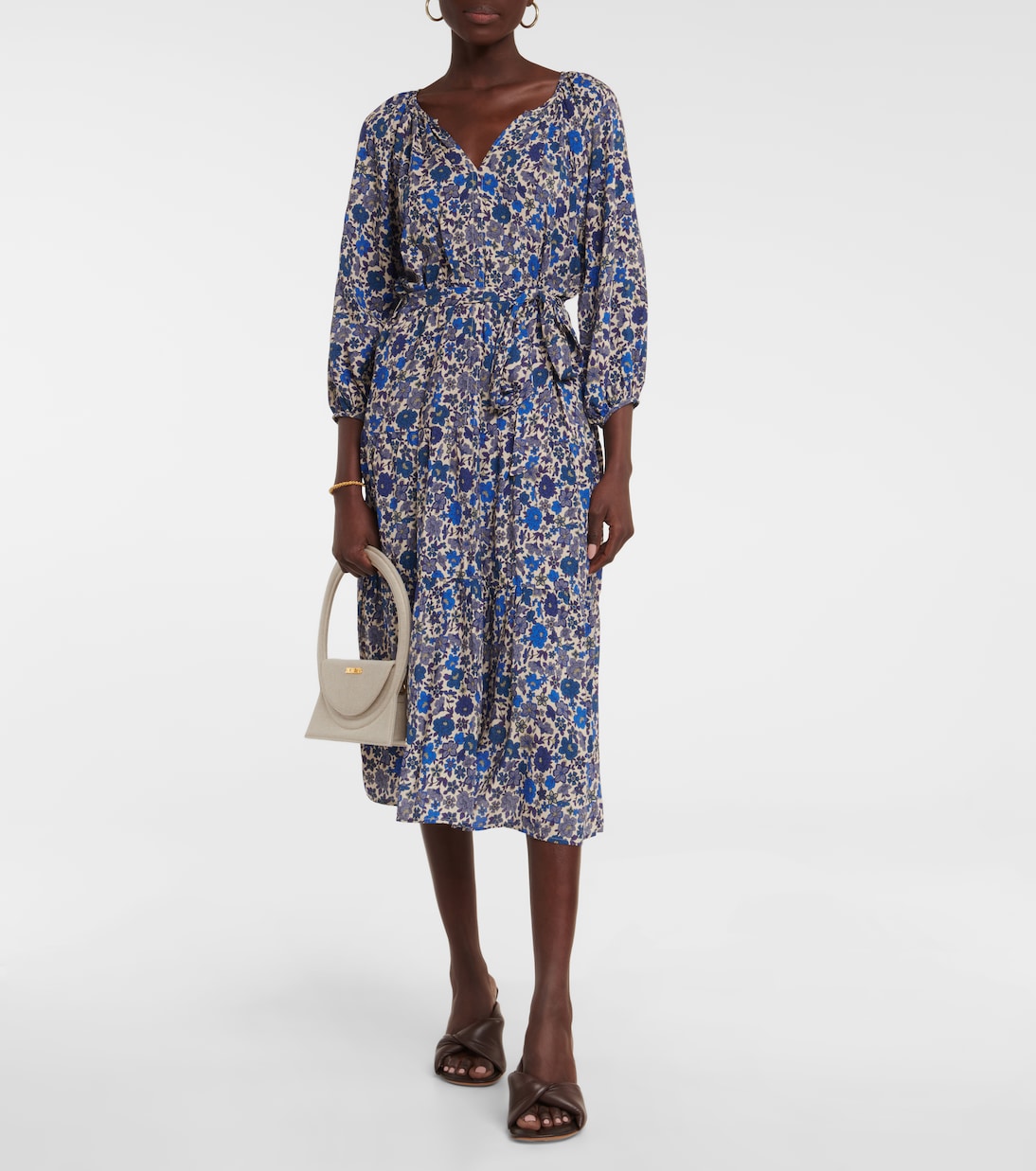 Сделано в США из фирменной ткани Velvet чаллис и имеет платье миди с синим цветочным принтом. Пояс на талии переходит в юбку со слегка плиссированными складками, создавая элегантный образ.