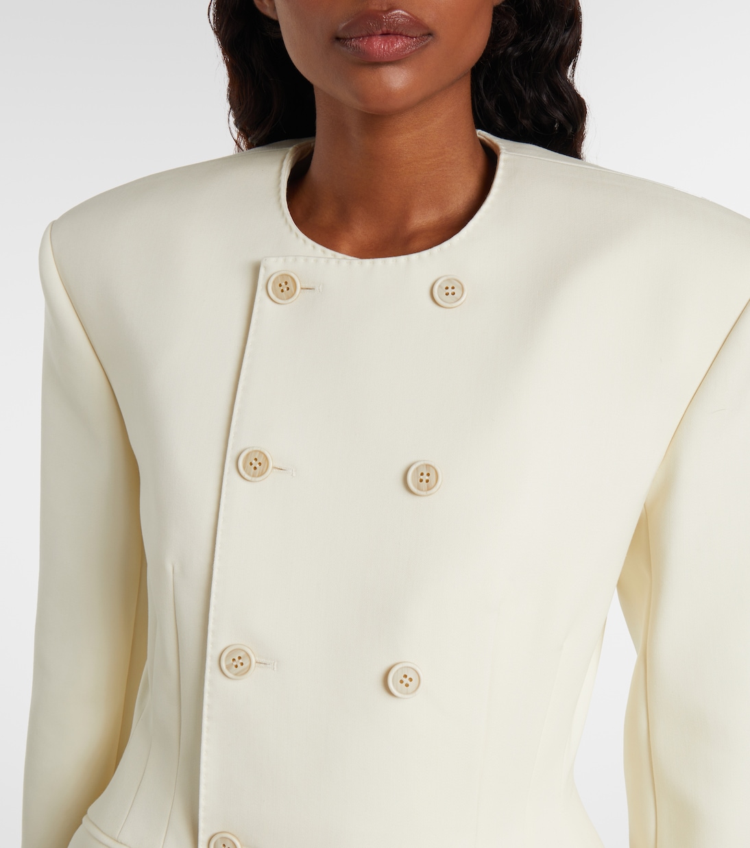 Сила и элегантность - ключевые слова, определяющие мини-платье RHW от Wardrobe.NYC. Этот белый стиль переосмысливает классический пошив благодаря своему гибридному силуэту с подбитыми плечами, вырезом без воротника и двубортной застежкой.