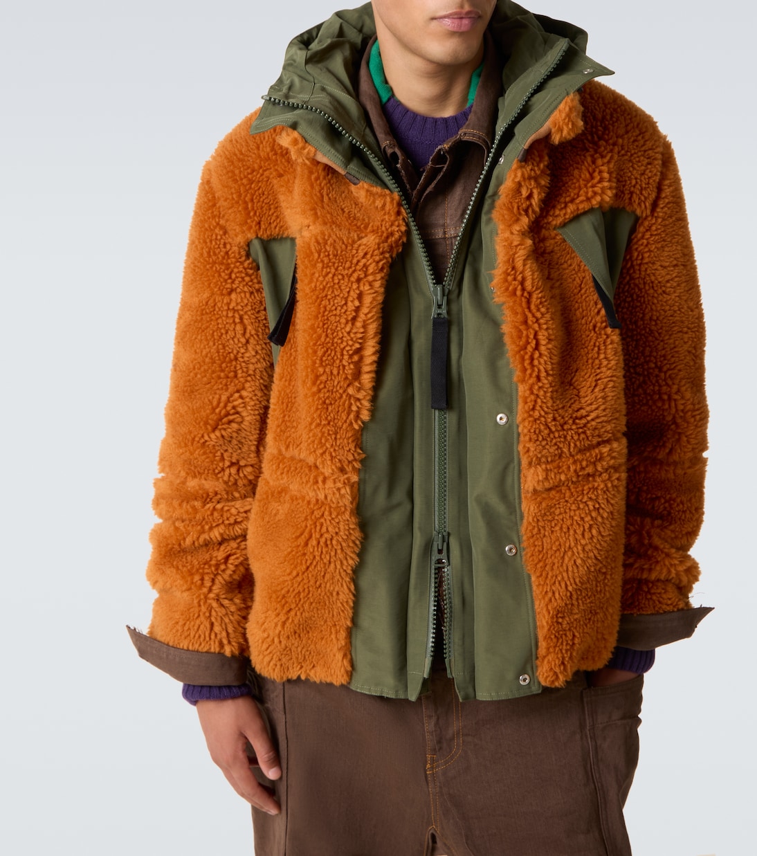 Склонность Сакаи к гибридному дизайну позволяет комбинировать контрастные текстуры, ткани и техники, создавая совершенно уникальные и инновационные стили. Эта куртка имеет мягкий шерстяной перед смесовой тканью с практичными брезентовыми панелями, застегивающимися на молнию спереди.