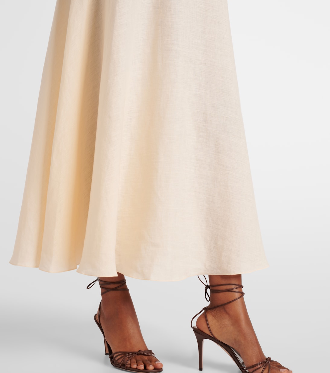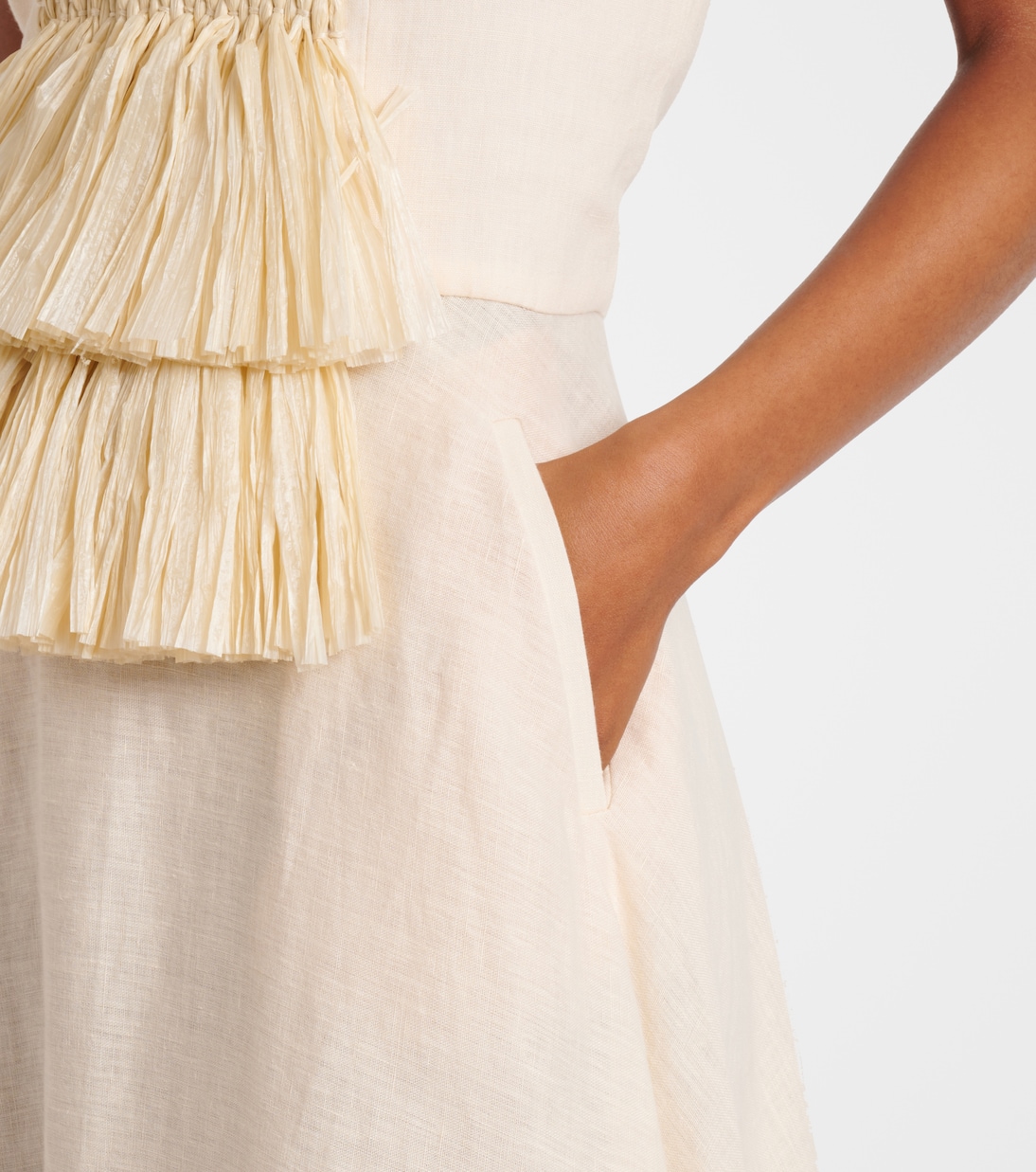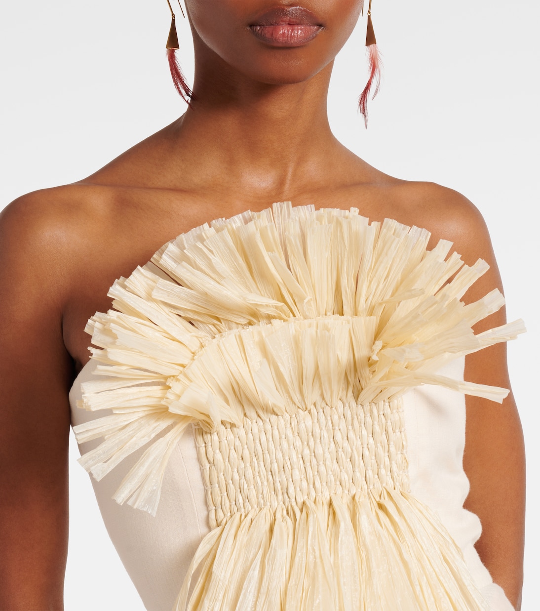 Создайте летний образ с этим макси-платьем от Johanna Ortiz. Модель выполнена из легкого льна, имеет силуэт без бретелек и украшена отделкой с эффектом рафии на лифе.