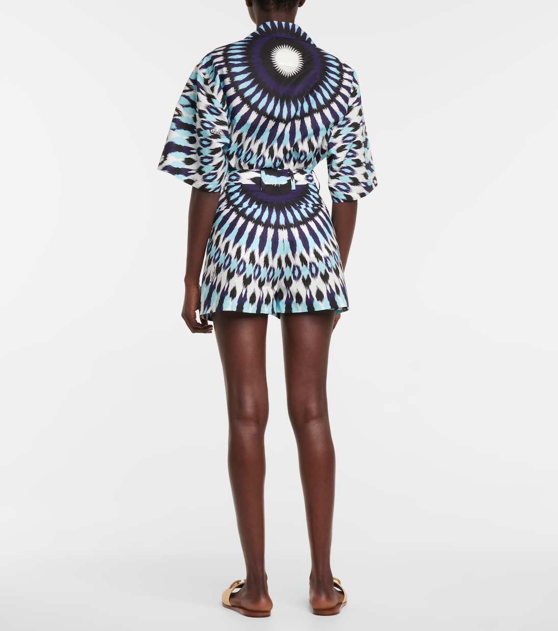 Создайте образ для теплой погоды на основе этих сине-белых шорт из эксклюзивной капсульной коллекции Valentino Escape. Они изготовлены из легкого и дышащего хлопкового поплина, украшены психоделическим архивным принтом и застегиваются на незаметную молнию сбоку. Стиль с простой белой майкой, заправленной на талии.