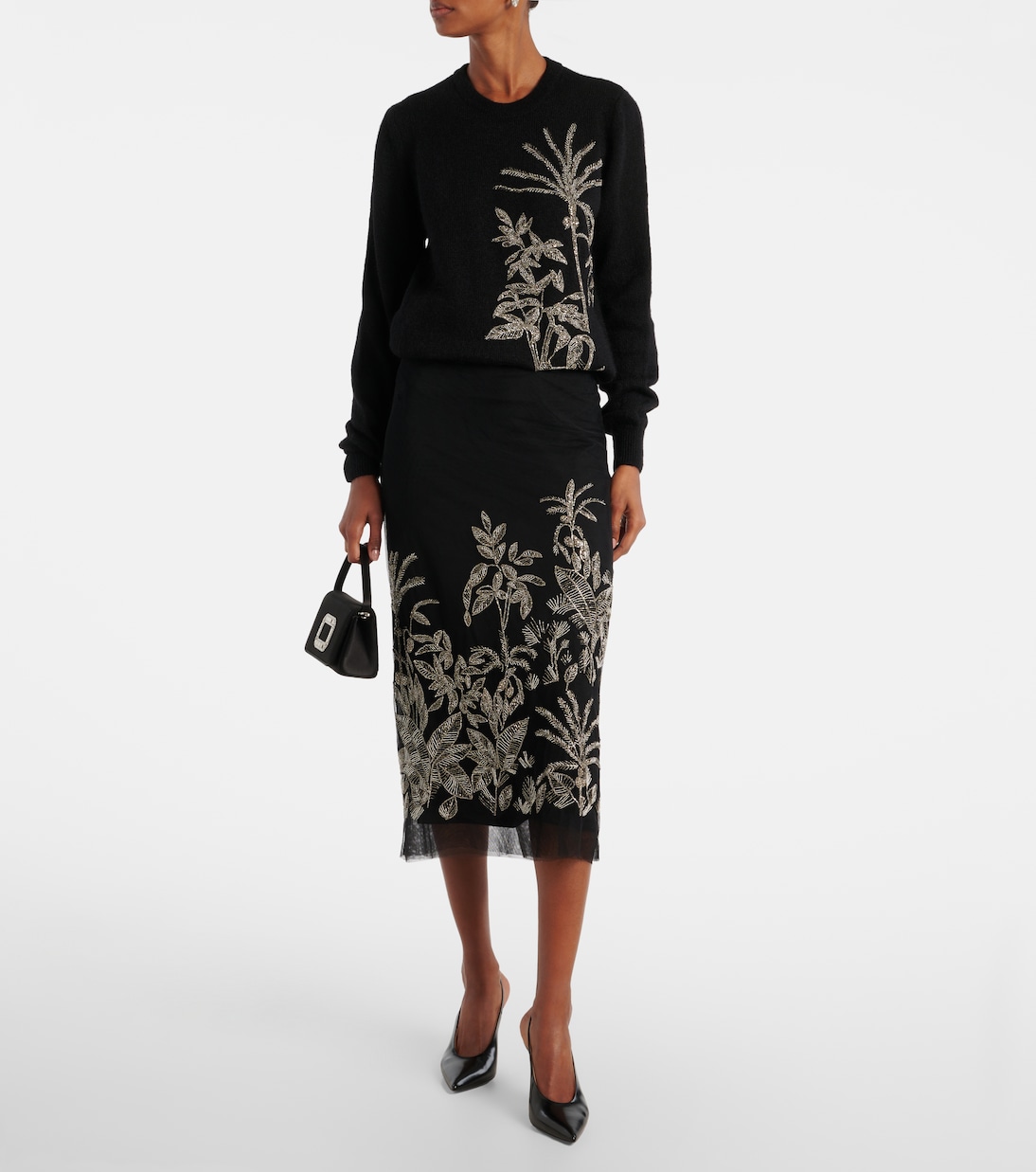 Струящиеся ткани, цветочные принты и нежная вышивка определяют романтический язык Costarellos. Свитер Noemie отражает этот дух с его аппликацией из бисера, классическим круглым вырезом и изысканной ребристой отделкой.