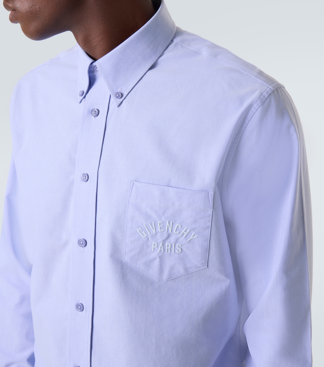 Точные и неподвластные времени дизайны Givenchy перекликаются с элегантными силуэтами первых лет существования бренда. Рубашка из хлопкового поплина с накладным карманом, украшенным логотипом бренда Givenchy Paris.