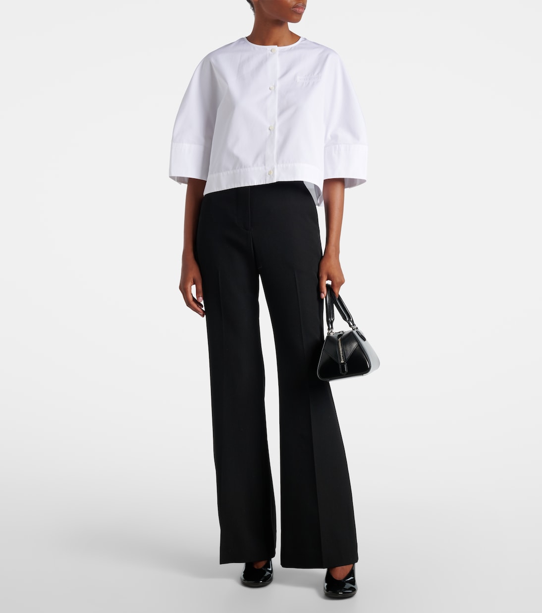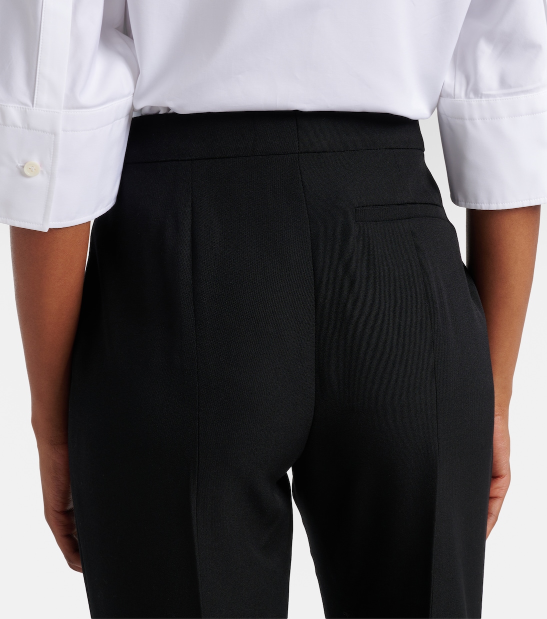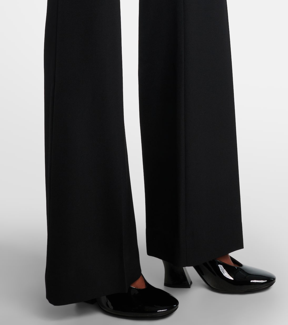 Точный и неподвластный времени крой Givenchy перекликается с элегантными силуэтами ранних лет бренда. Расклешенные брюки изготовлены в Италии из шерсти. Модель средней посадки застегивается на молнию, крючок и пуговицы.