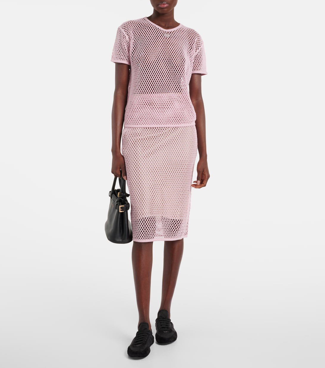 Треугольный логотип Prada отдает дань давней связи бренда с итальянской королевской семьей, Савойским домом. Эта юбка миди, связанная крючком, имеет прямой крой и съемную подкладку с фирменным логотипом сзади.