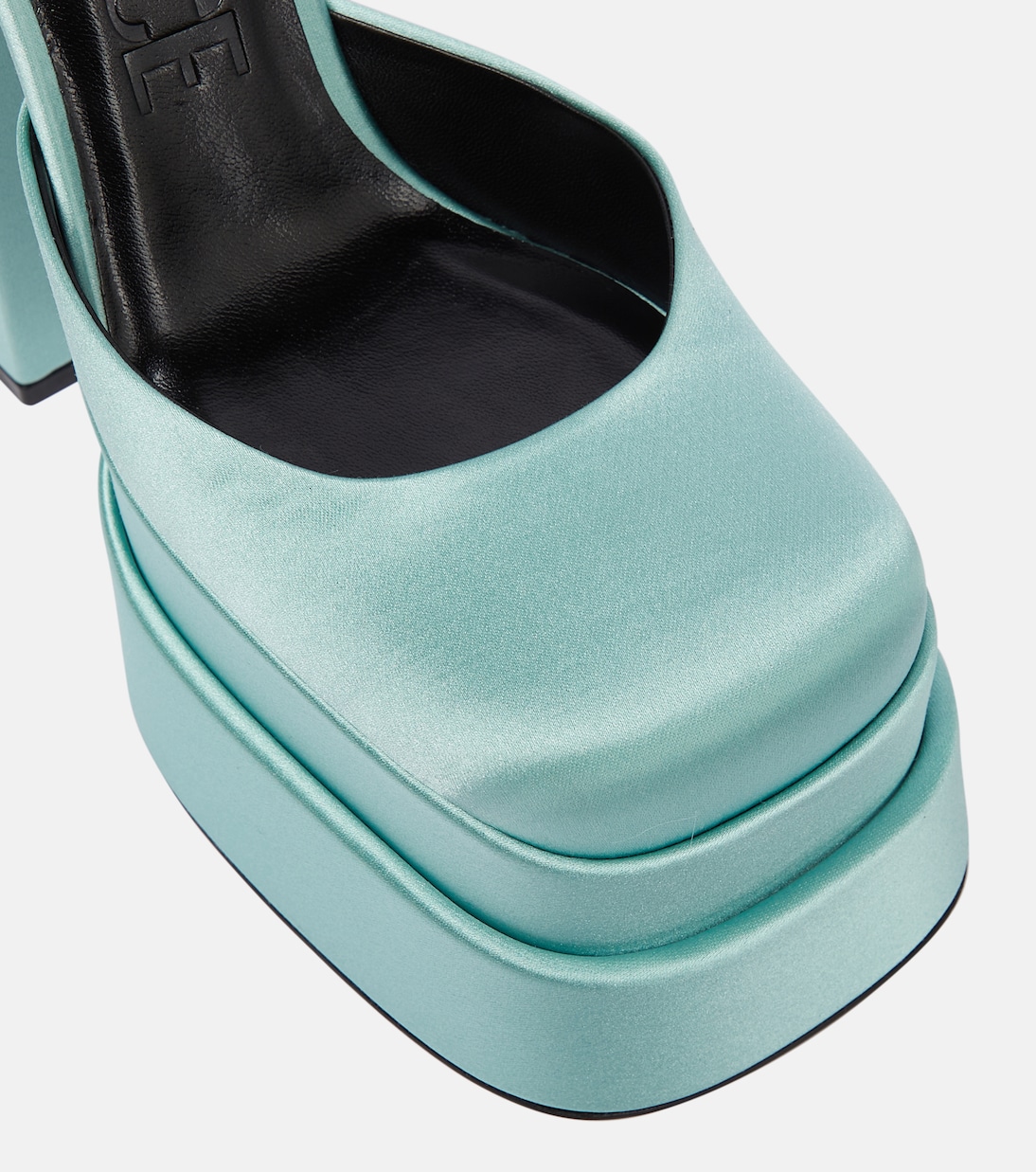 Туфли Medusa Aevitas от Versace - образец яркого гламура. Они сделаны из синего атласа с высокими двойными платформами и тонкими ремешками на щиколотке, украшенными кристаллами и подвесками в виде Медузы.