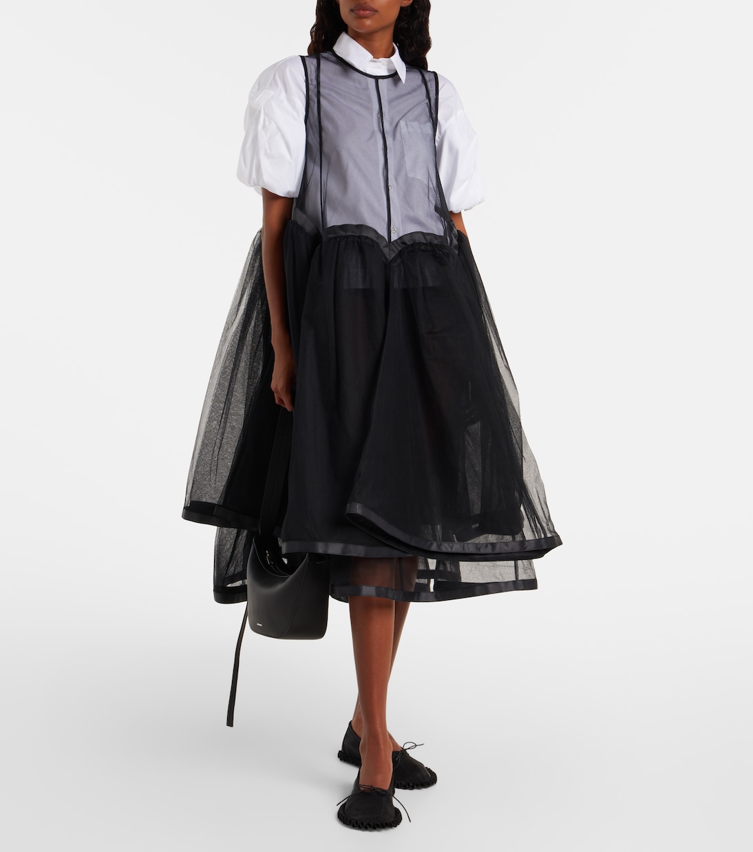 Тюль, состоящий из нескольких слоев прозрачных панелей или собранный в воздушные оборки, является идеальным материалом для выразительных дизайнов Noir Kei Ninomiya. Платье миди с прозрачным верхом и застежкой-молнией сзади.