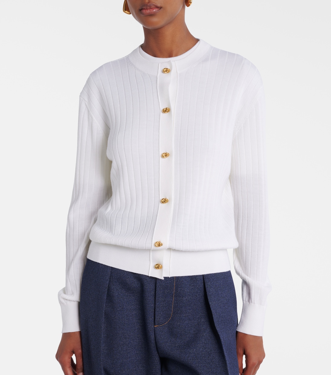 Узловатые детали, которые с 90-х годов являются синонимом Bottega Veneta, стали неразрывно связаны с индивидуальностью дома. Этот кардиган из рубчатой вязки с золотистыми пуговицами, подчеркивающими фирменный мотив, станет вневременным дополнением к вашему гардеробу.