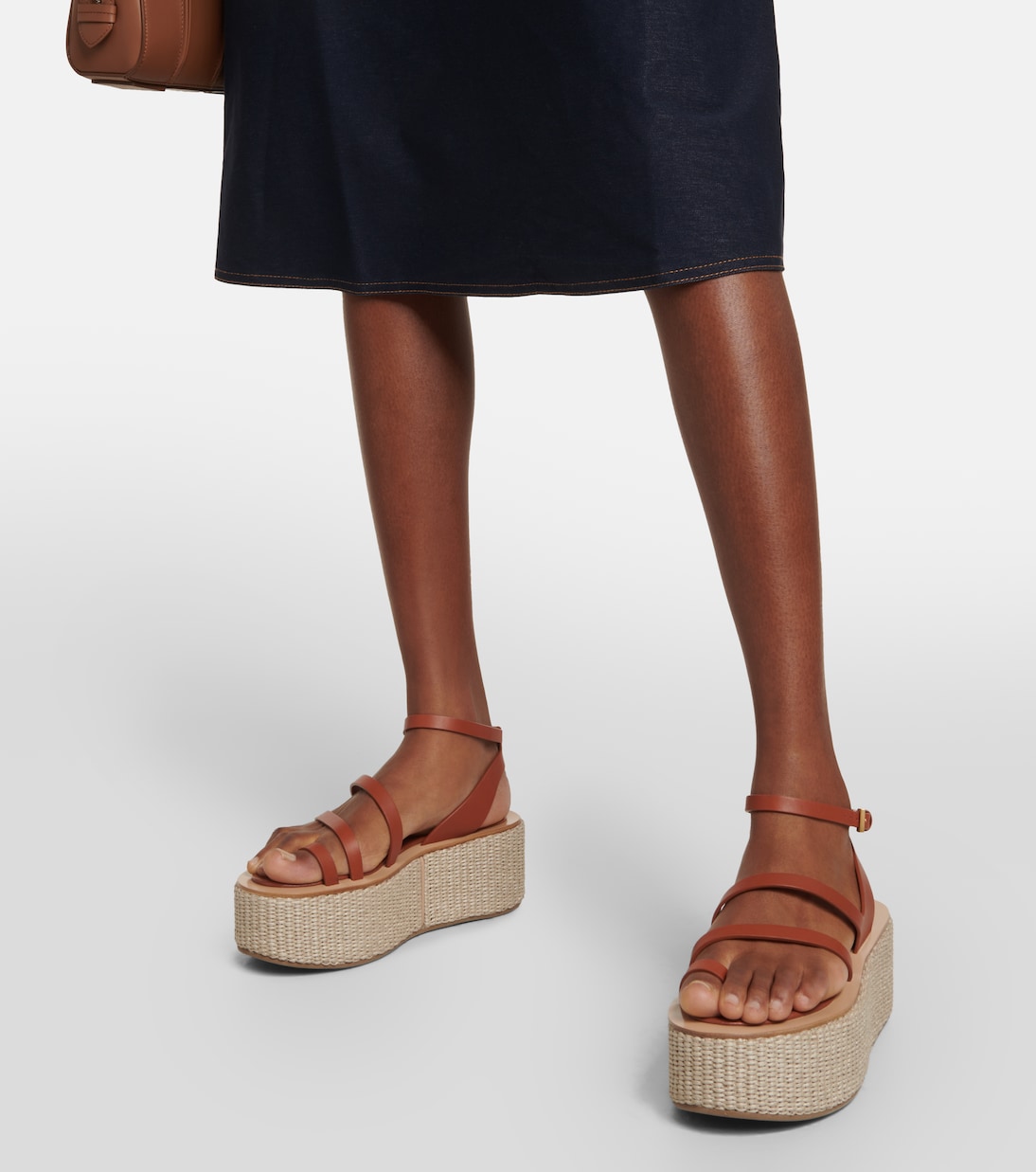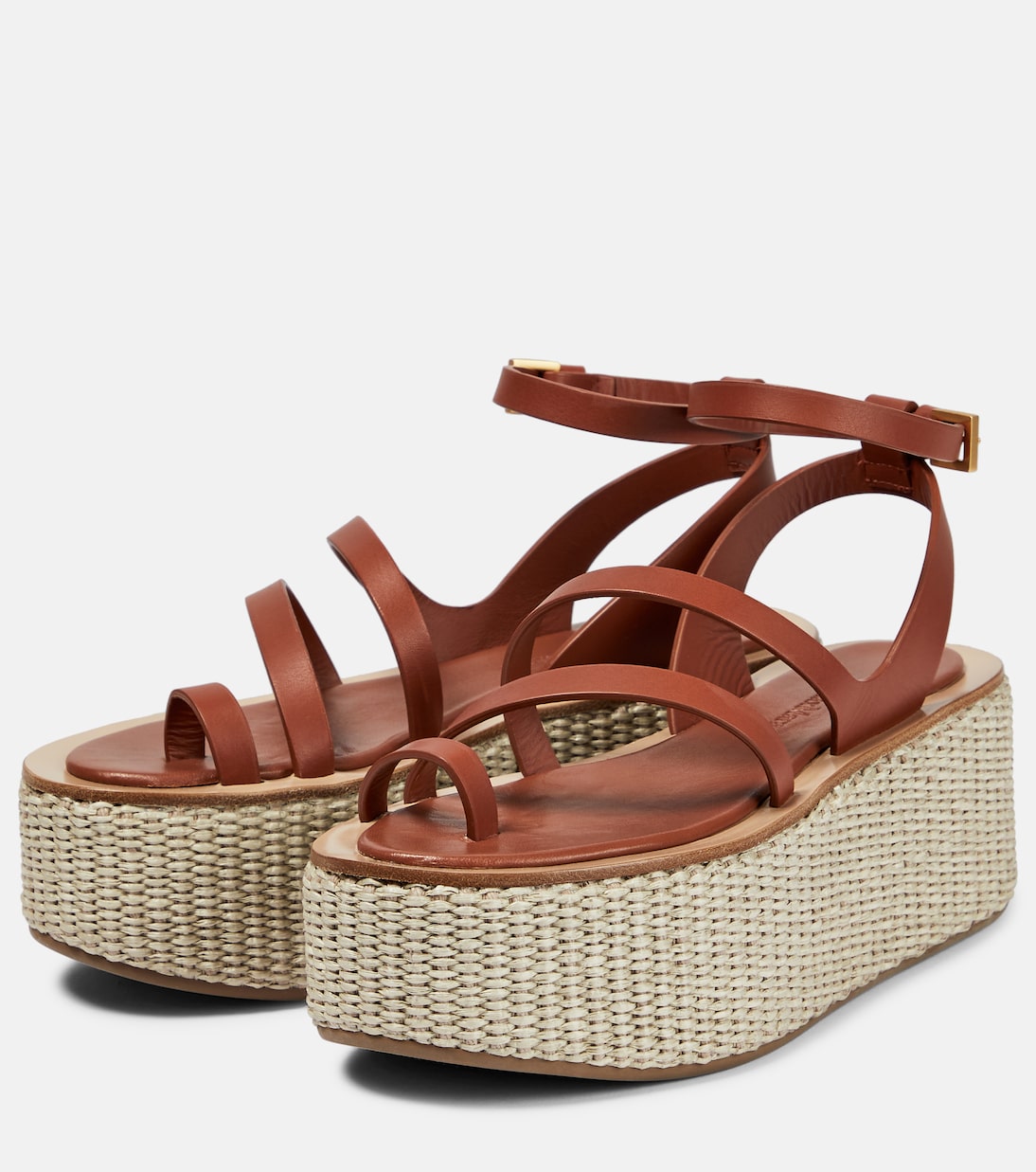 Украсьте свой гардероб для отпуска моделями, удлиняющими ноги, например, эспадрильями Biarritz от Max Mara. Изготовленная из гладкой кожи, эта пара имеет толстую платформу и фиксирующие ремешки на щиколотке.