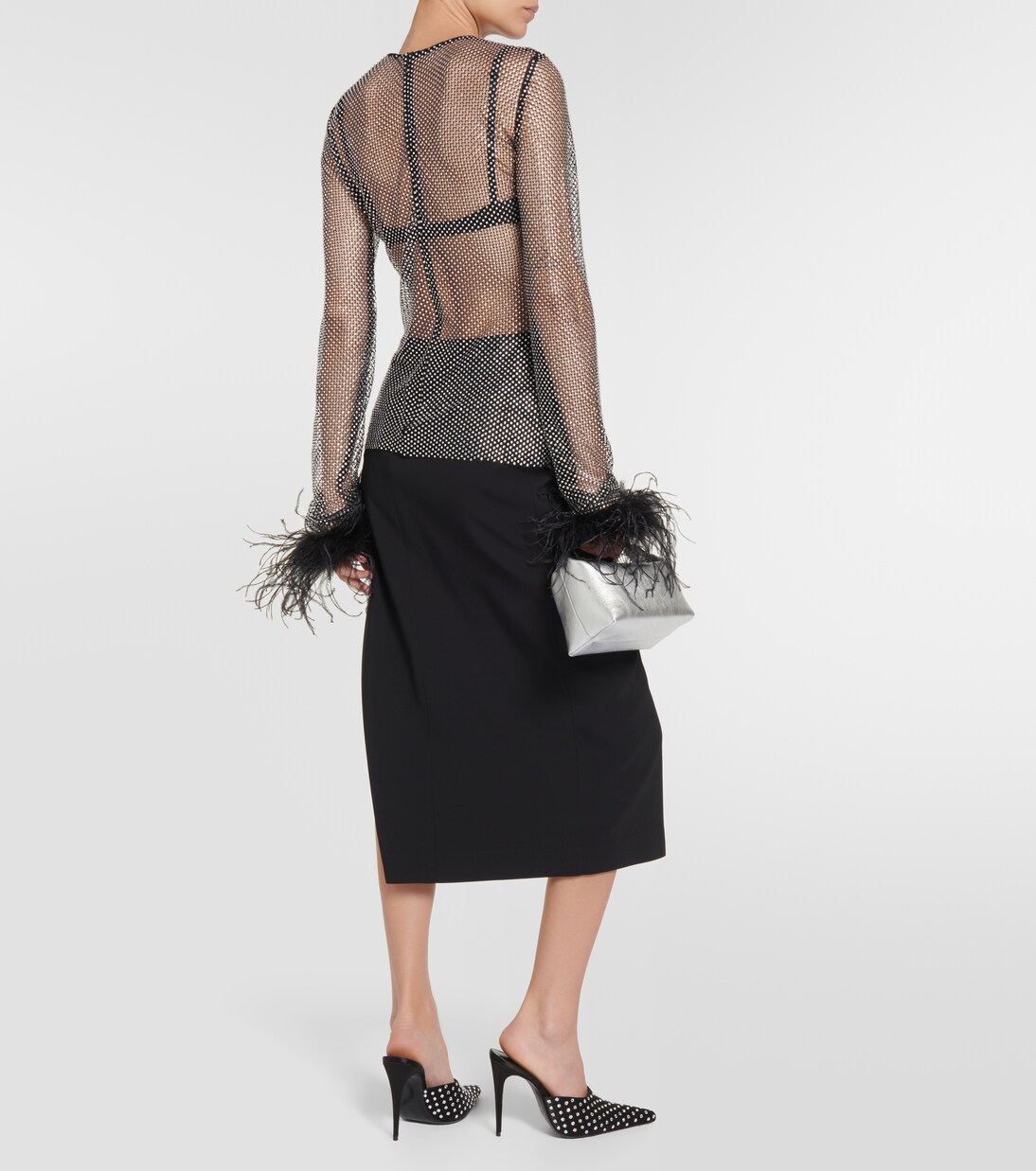 Украсьте свой ночной образ этим сетчатым топом от Giuseppe di Morabito. Модель с длинными рукавами дополнена гламурными манжетами с перьями и стразами, а также застегивается на молнию на спине.