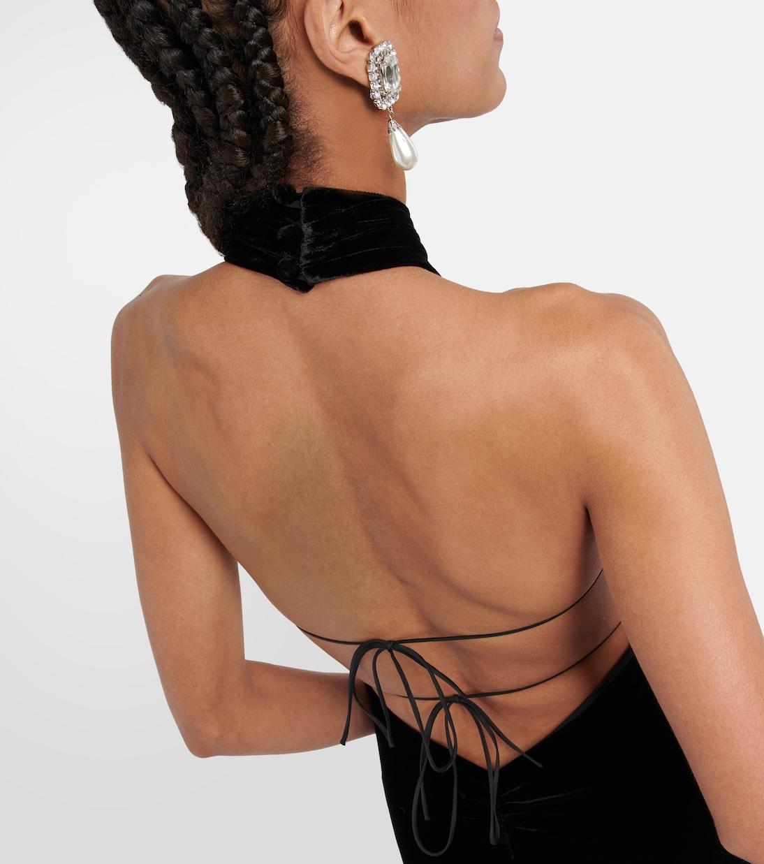 Украсьте свой образ с маленьким черным платьем этим роскошным платьем от Алессандры Рич. Платье из черного бархата с завязкой на шее имеет соблазнительный вырез на лифе, завязки сзади и расклешенную юбку.
