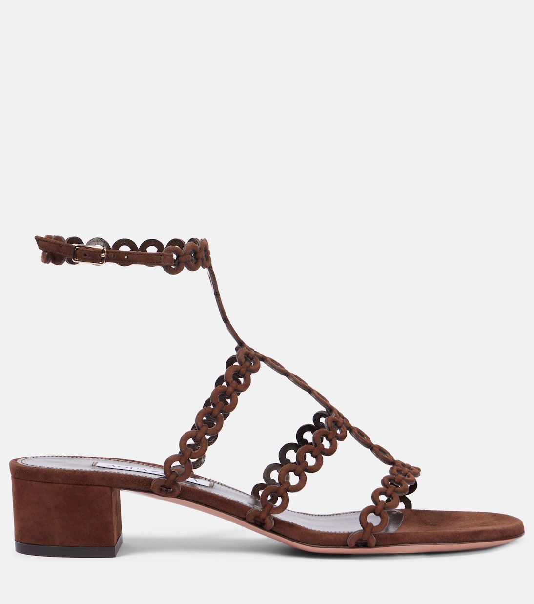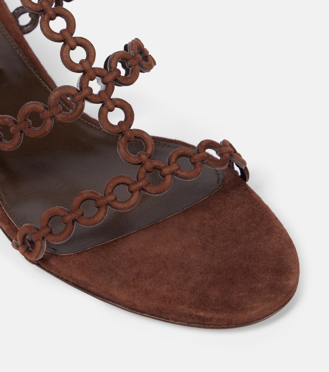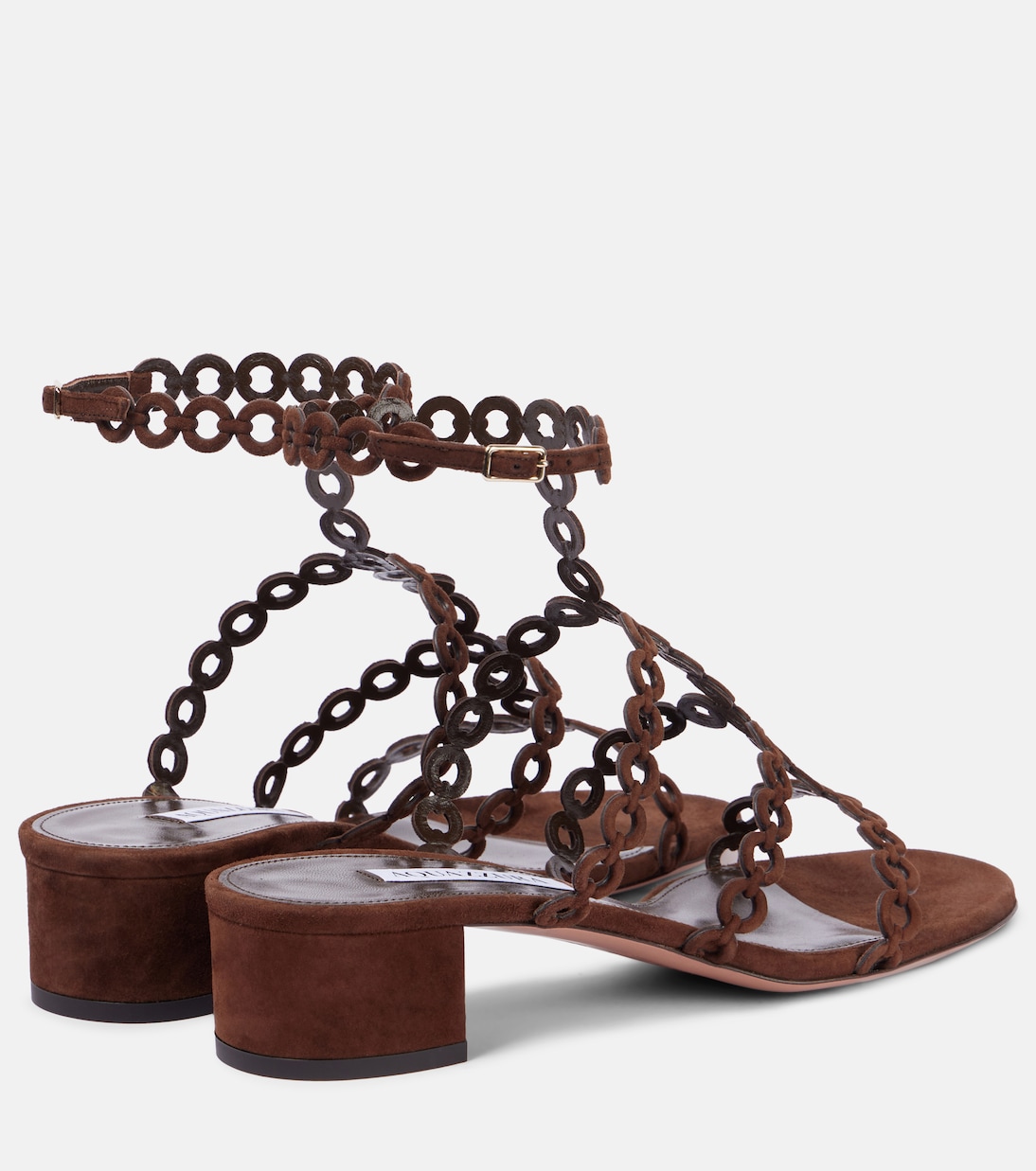Украсьте свою летнюю обувь сандалиями Infinity Chain от Aquazzurra. Разработанный с элегантным мотивом, напоминающим бесконечность, этот простой и в то же время гламурный стиль изготовлен в Италии из коричневой замши и кожи.