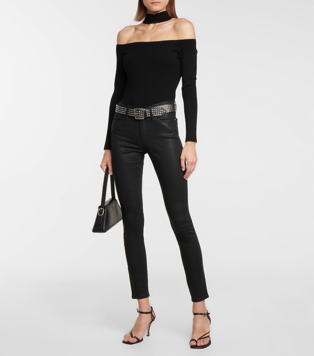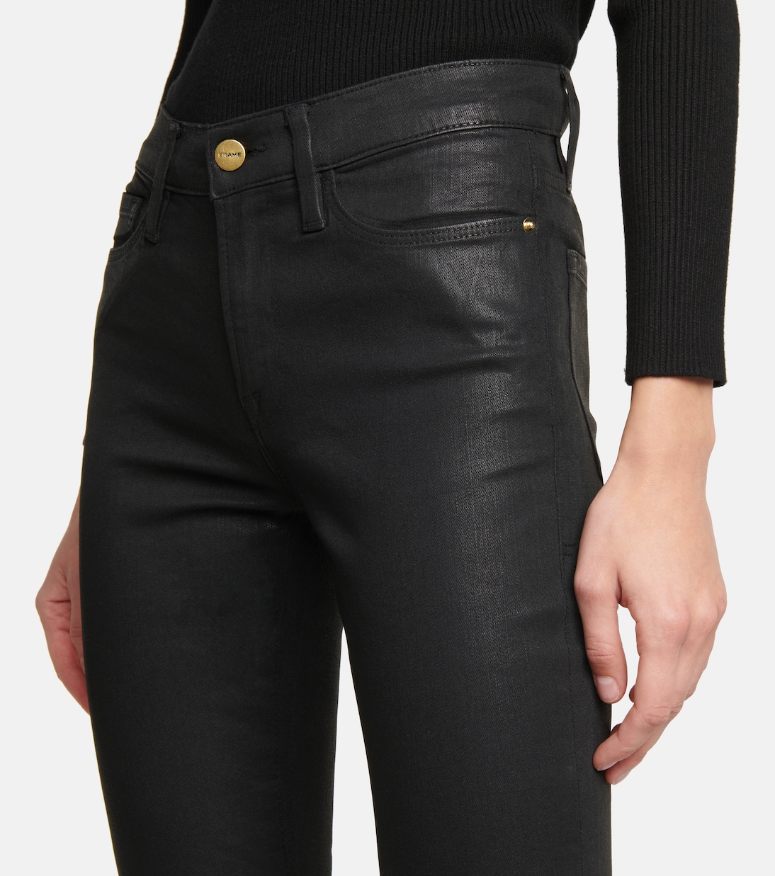 Черные джинсы Le Skinny De Jeanne от FRAME - проверенная временем базовая вещь, которую вы будете носить каждый сезон. Сделанные в США из суперэластичного хлопкового денима с покрытием, имитирующим кожу, они имеют среднюю посадку и узкие штанины. Закатайте манжеты, чтобы продемонстрировать ваши любимые варианты обуви.