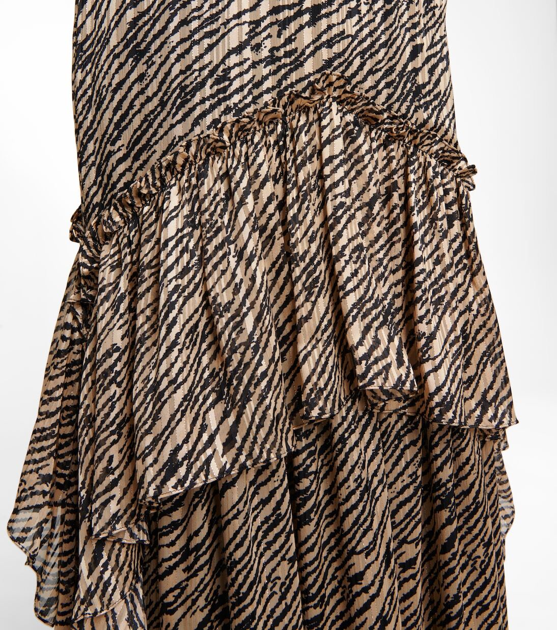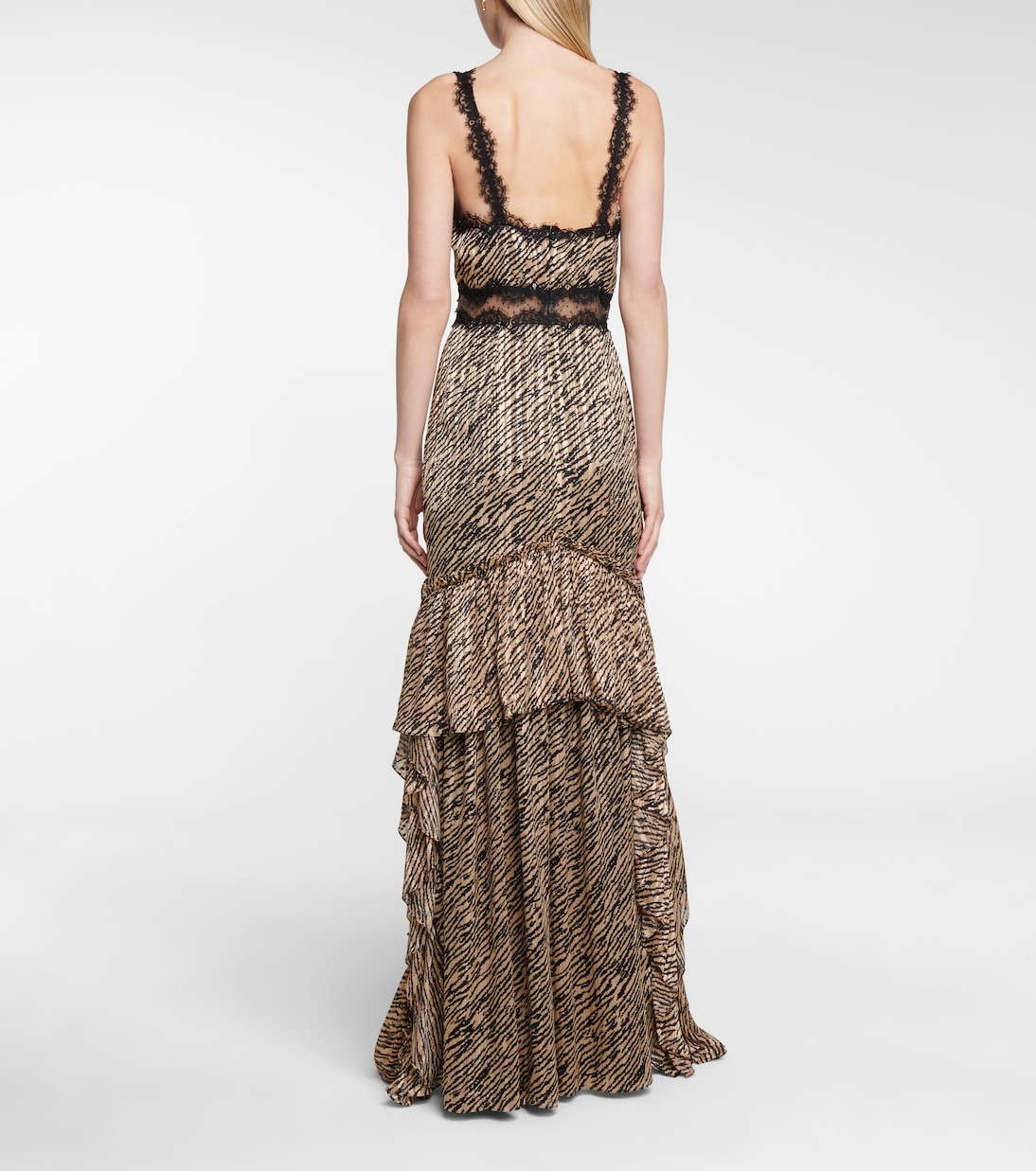Шифоновое платье Farah от Costarellos с тигровым принтом по всей длине остается верным характерной экстравагантной эстетике бренда. Платье с черным кружевом и отделкой пуэн-деспри, обрамляющей глубокий вырез, имеет юбку, ниспадающую до пола оборками ярусами.
