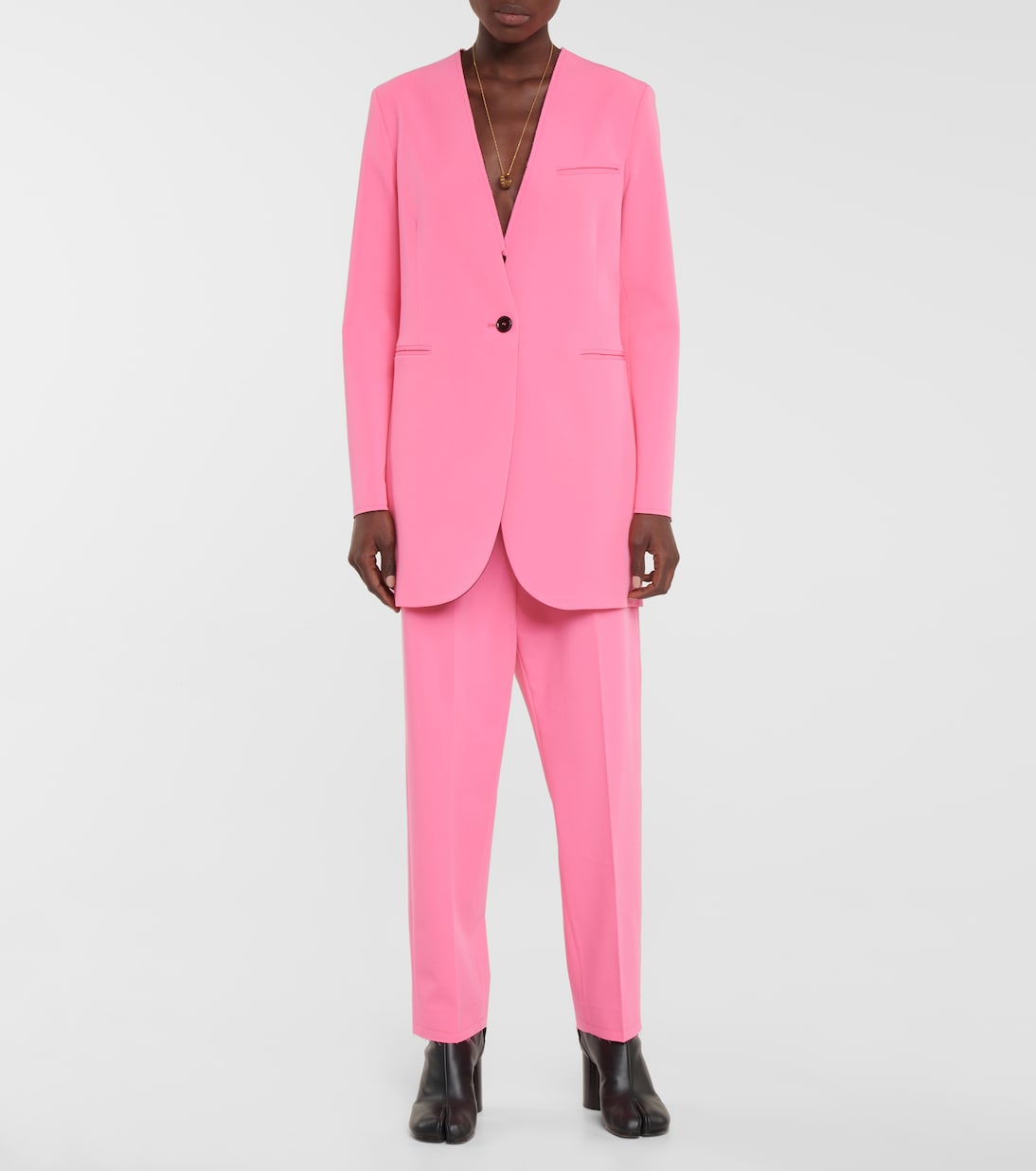 Элегантные костюмеры знают, что создать современный и актуальный образ можно с помощью яркого блейзера, например, этого неоново-розового пиджака от MM6 Maison Margiela. Он выполнен из костюмной ткани средней плотности с цельноатласной подкладкой для создания эффекта многослойности, а также дополнен современными деталями: вырезом без воротника и необработанными краями. Дополните образ подходящими брюками.