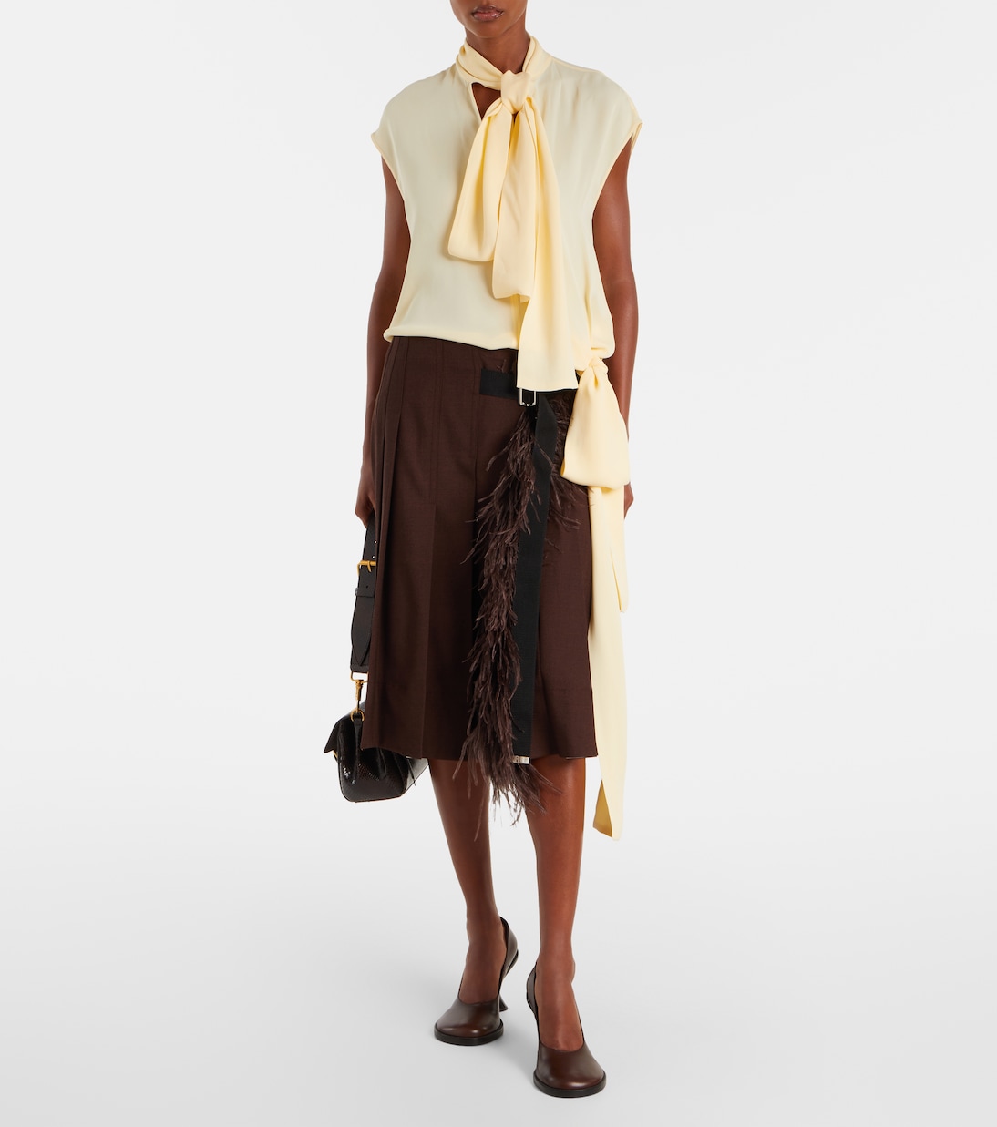 Эта блузка от Plan C идеально подходит для деловых и повседневных образов и отличается струящимся силуэтом. Безрукавка выделяется длинными завязками на шее и асимметричным подолом, подчеркнутым бантом.