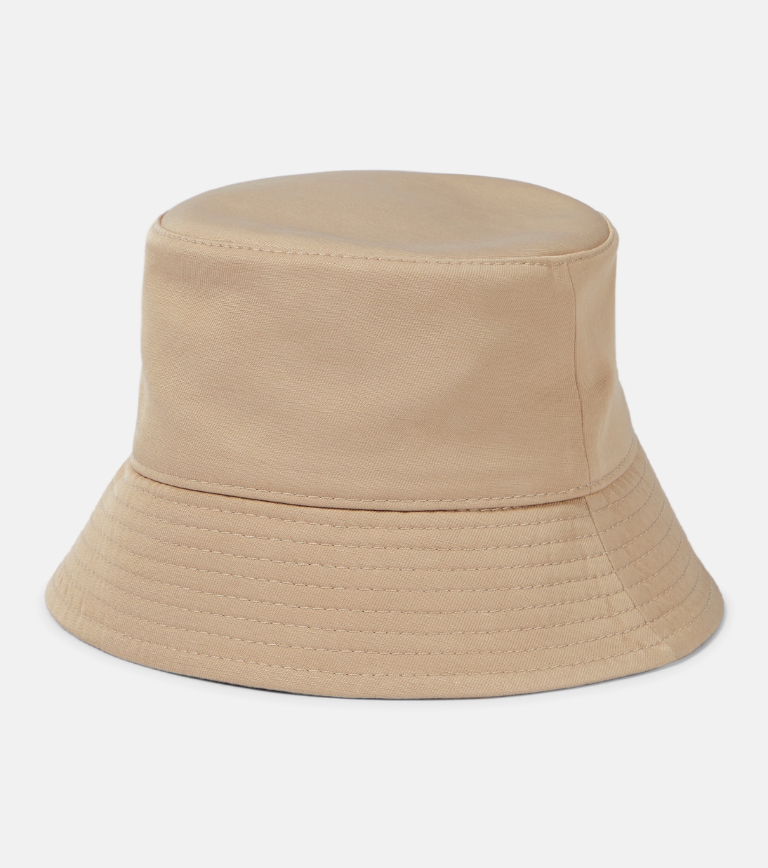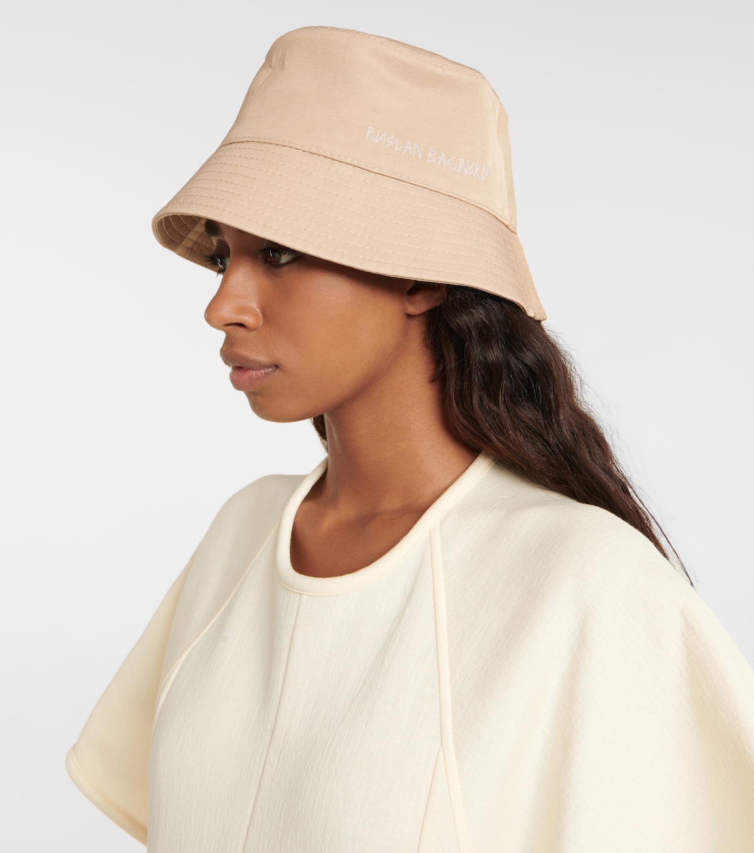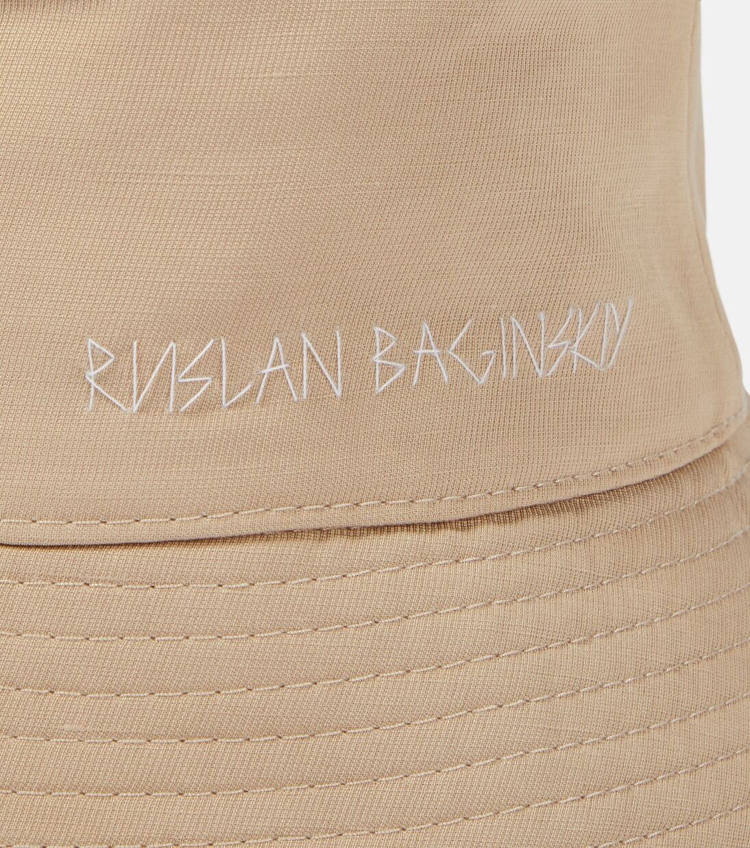 Эта классическая панама от Руслана Багинского имеет широкие прошитые поля. Изготовлено из габардина и украшено вышитыми буквами логотипа в тон.