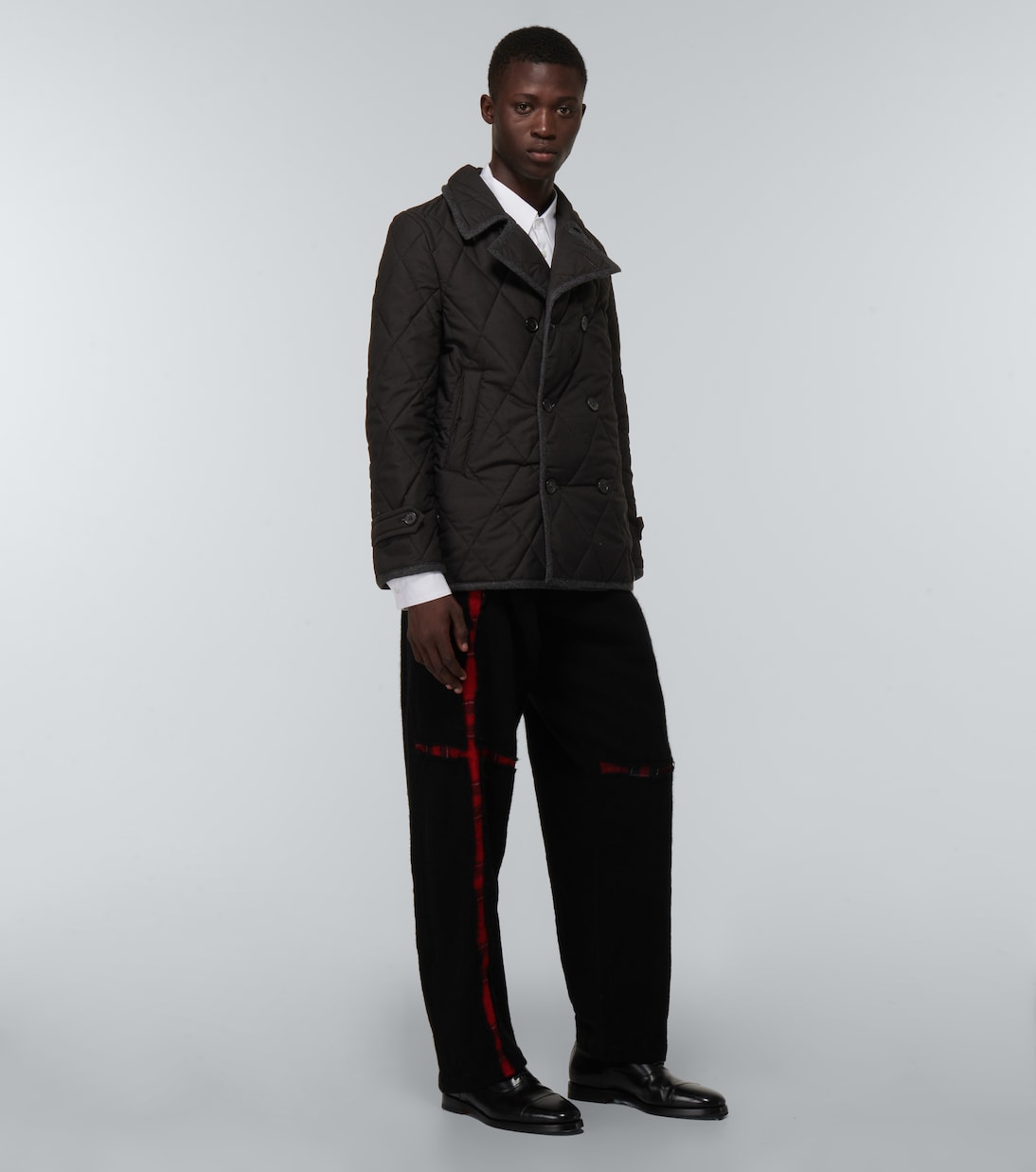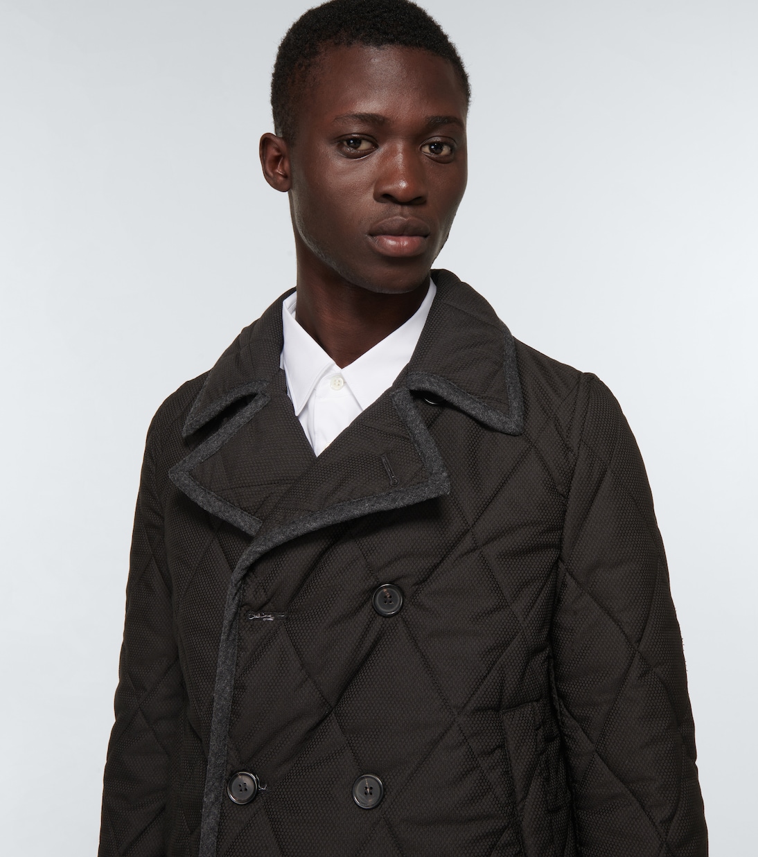 Эта куртка от Comme des Garçons Shirt, выполненная из стеганой технической ткани, имеет двубортный передний крой и прорезные карманы по бокам.