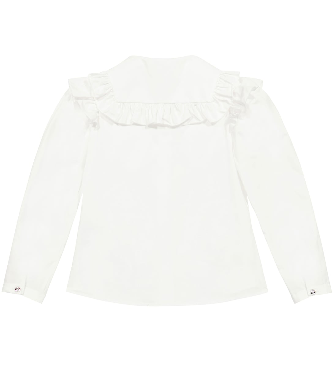 Эта очаровательная рубашка от Monnalisa понравится малышам готовиться к важному событию. Изготовлена из белого хлопкового поплина с рукавами-буфами, манжетами на пуговицах и воротничком с оборкой.