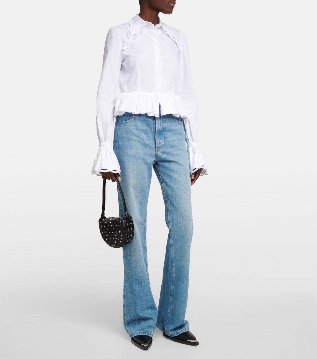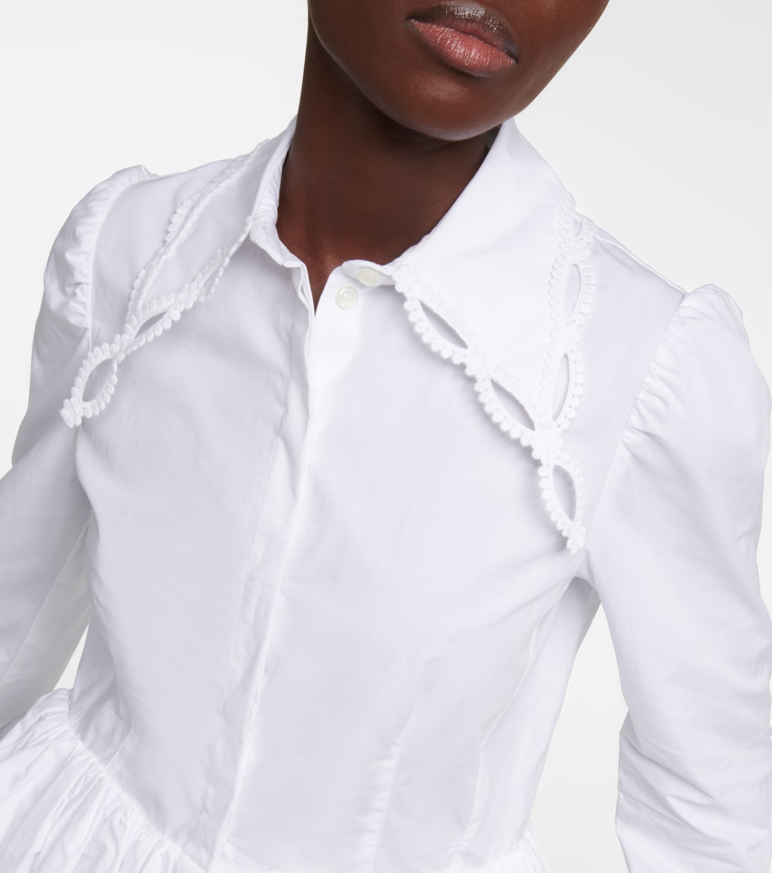Эта рубашка от Paco Rabanne мгновенно украсит любой ансамбль. Романтичный стиль выполнен из плотного хлопкового поплина с баской по подолу, оборками и фестончатой отделкой на манжетах и воротнике.