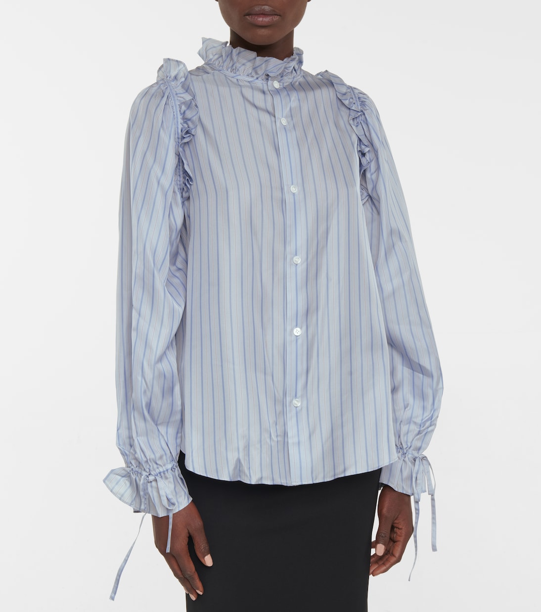 Эта светло-голубая полосатая блузка, выполненная в Японии, демонстрирует фирменную технику рюш от Noir Kei Ninomiya. Прямой крой, ложный вырез горловины и завязывающиеся манжеты для придания женственности.