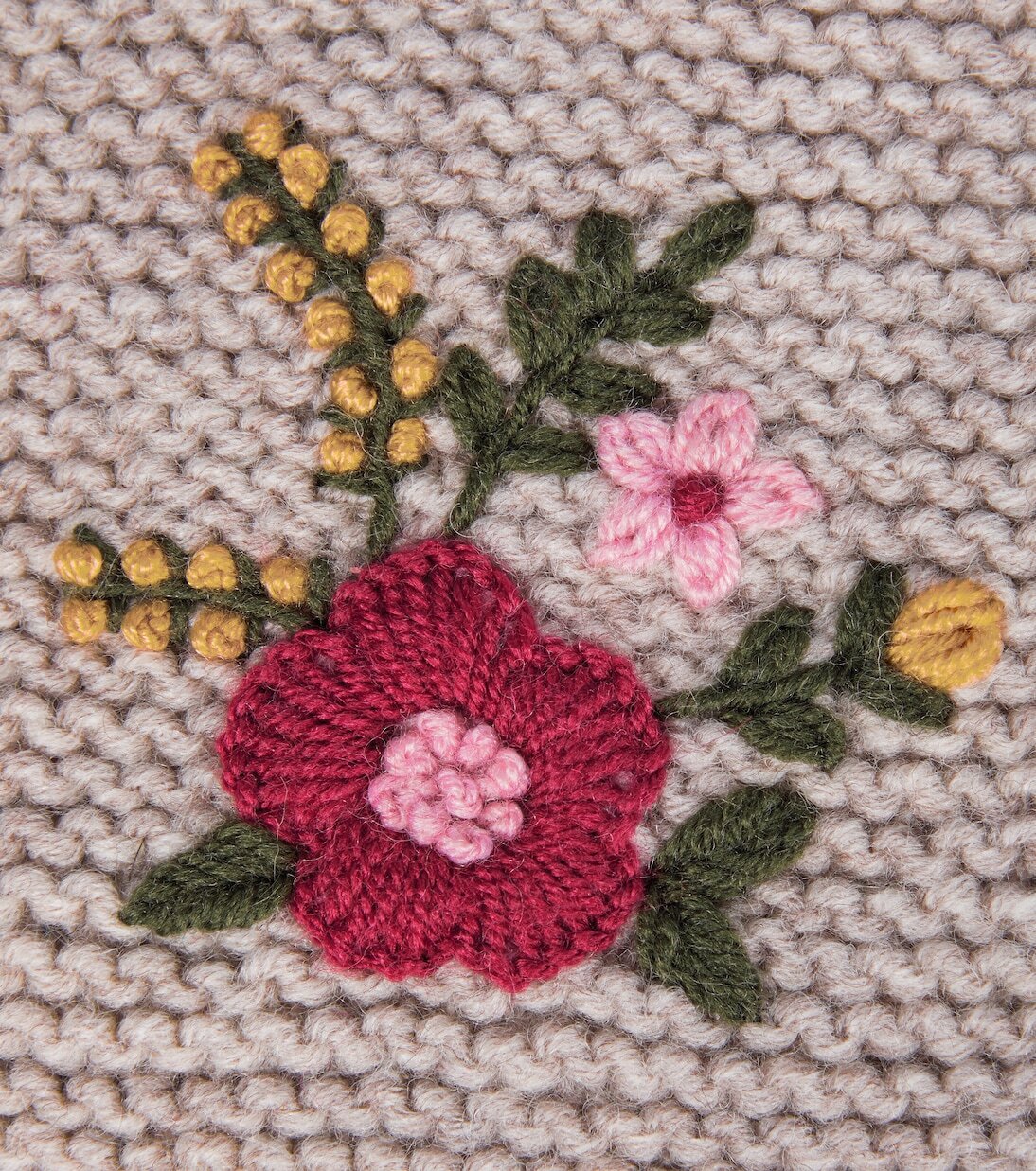 Эта серо-коричневая шапочка Thyone от Caramel связана из легкого трикотажа с добавлением шерсти, что создает уют в прохладные дни. Помпон сверху и цветочная вышивка на застежке делают ее еще более веселой.