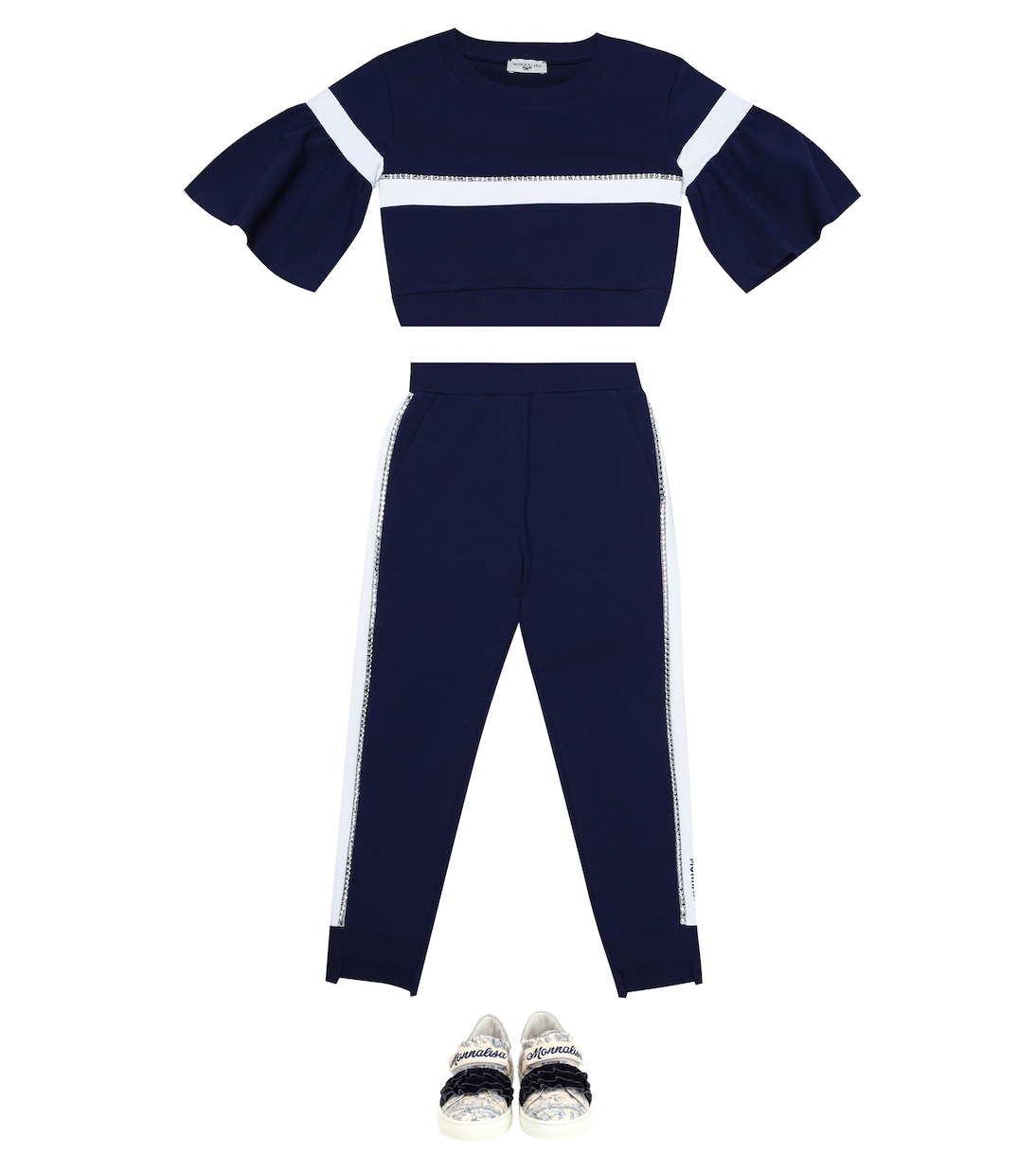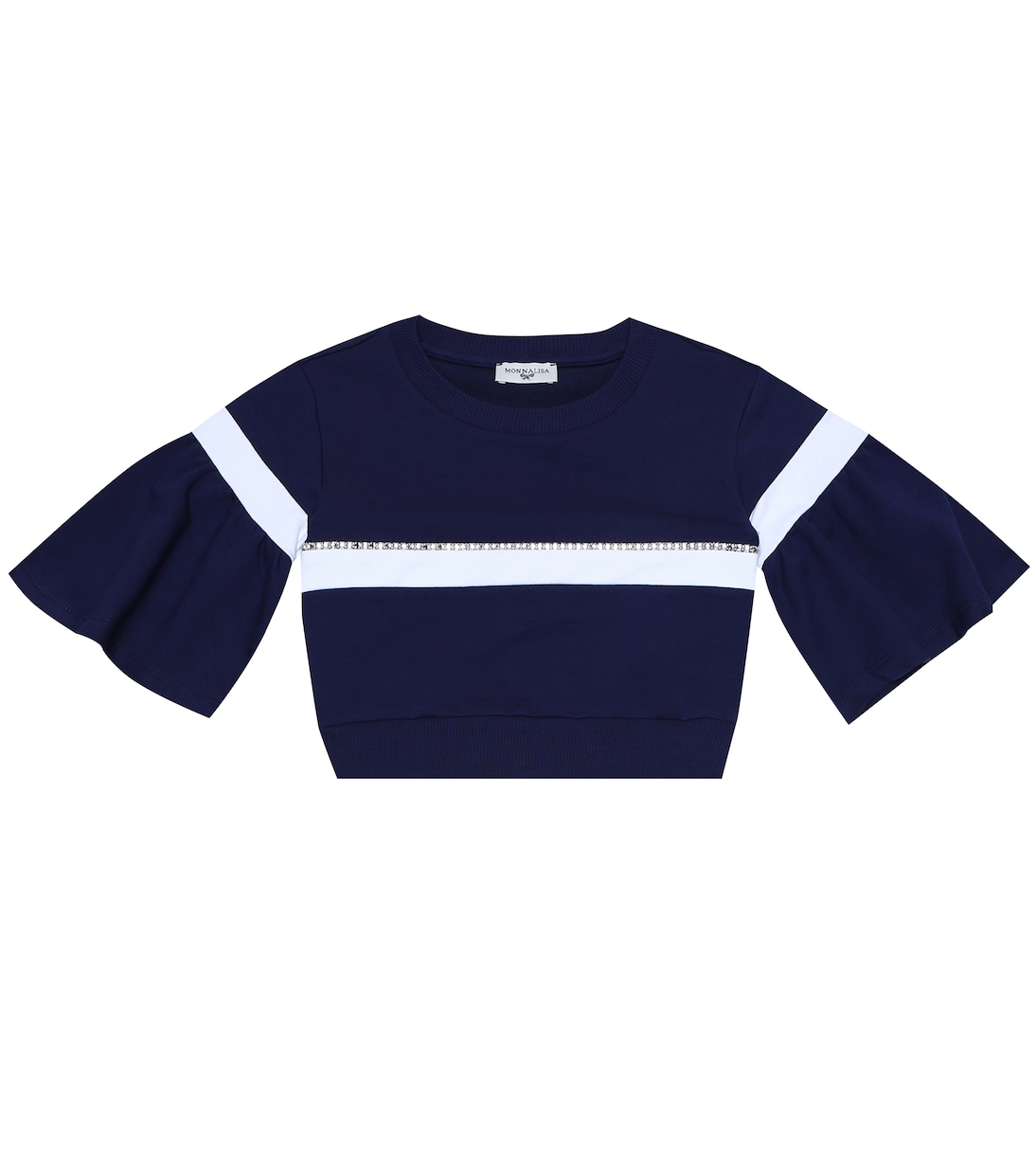 Эта темно-синяя толстовка от Monnalisa идеально подходит для игр: она сшита из легкого и дышащего эластичного хлопкового трикотажа. Свободный силуэт дополнен мерцающими кристаллами на белой полосе на груди.