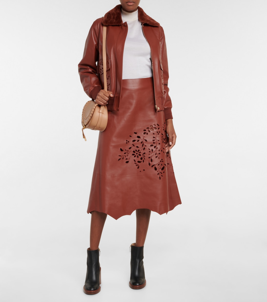 Эта юбка миди выполнена из мягкой кожи наппа с перфорированным растительным мотивом, который отсылает к любви Chloé к акцентам в стиле бродери англез. Расклешенный силуэт с неровным необработанным подолом.