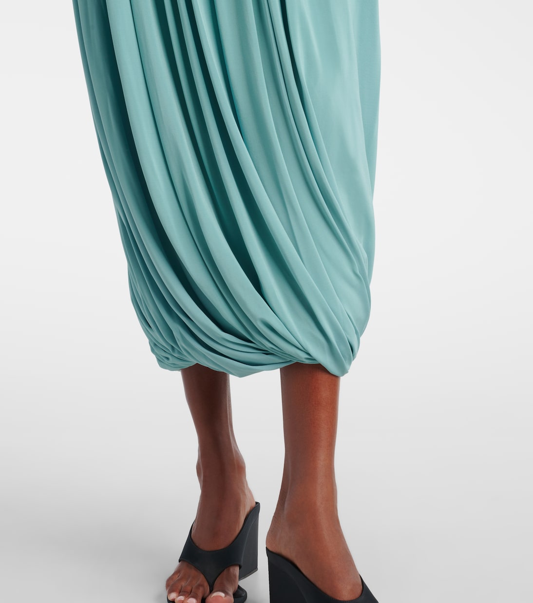 Эта юбка миди от Alaïa изготовлена в Италии из мягкого джерси и представляет собой идеальный баланс между непринужденностью и изысканным стилем. Это элегантное изделие характеризуется присборенной драпировкой с подолом-пузырьком, подчеркивающим его струящийся силуэт.