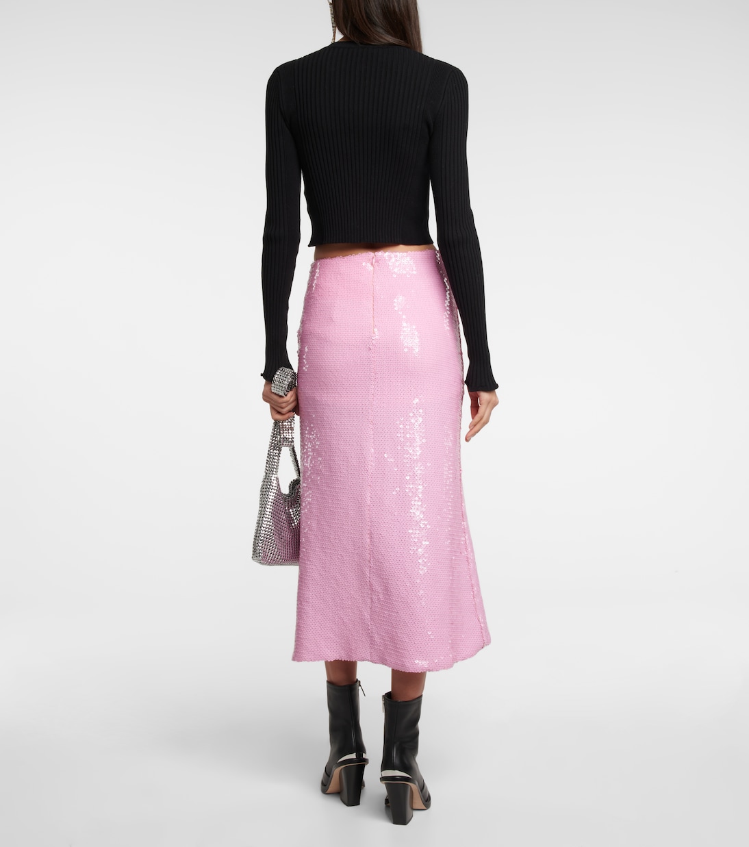 Эта юбка миди от Paco Rabanne, расшитая пайетками конфетно-розового цвета, просто создана для танцпола. Блестящий декорированный стиль включает в себя сборку на заниженной талии, золотистые пуговицы и асимметричный разрез по подолу.
