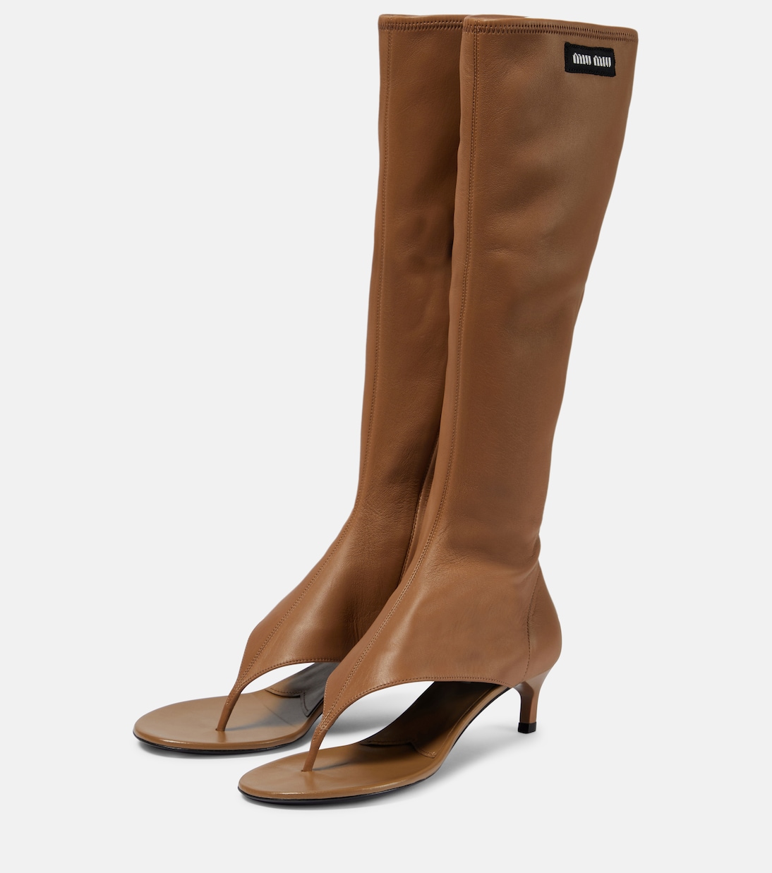 Эти босоножки до колена изготовлены из тонкой кожи наппа и имеют открытый носок и нашивку с логотипом сбоку. Эластичный дизайн дополнен боковой застежкой-молнией и низким каблуком для вашего комфорта.