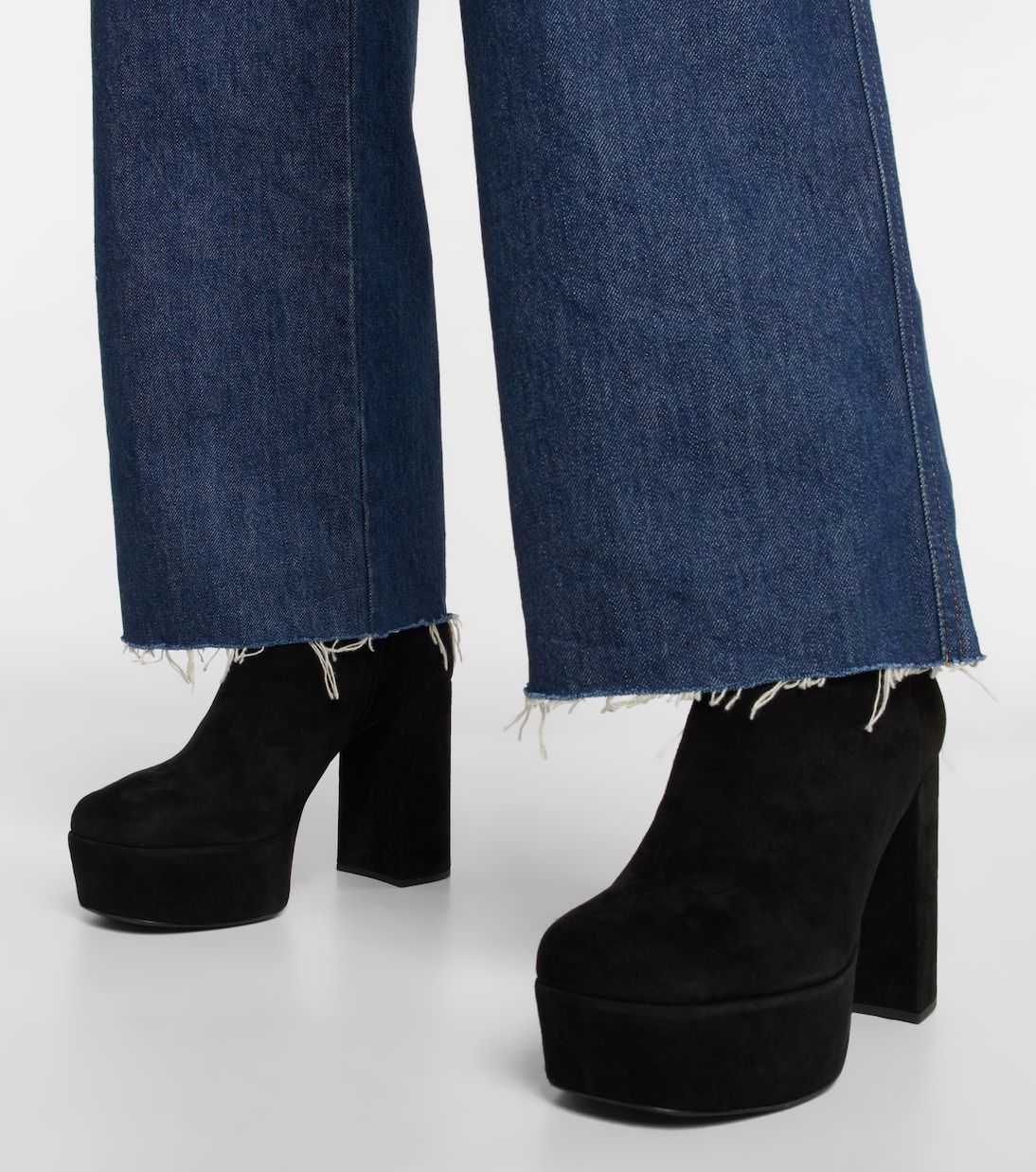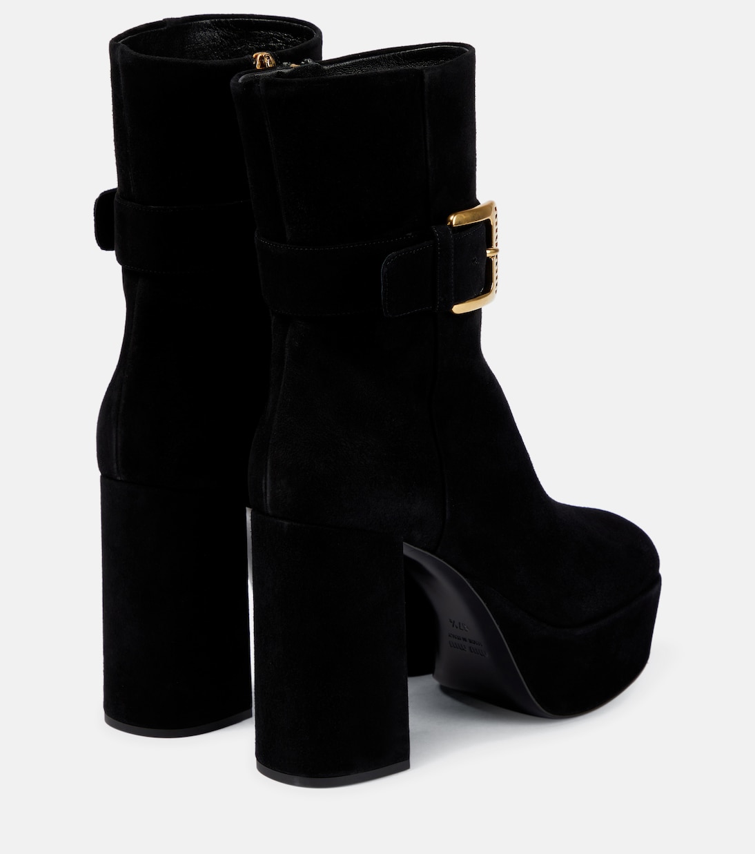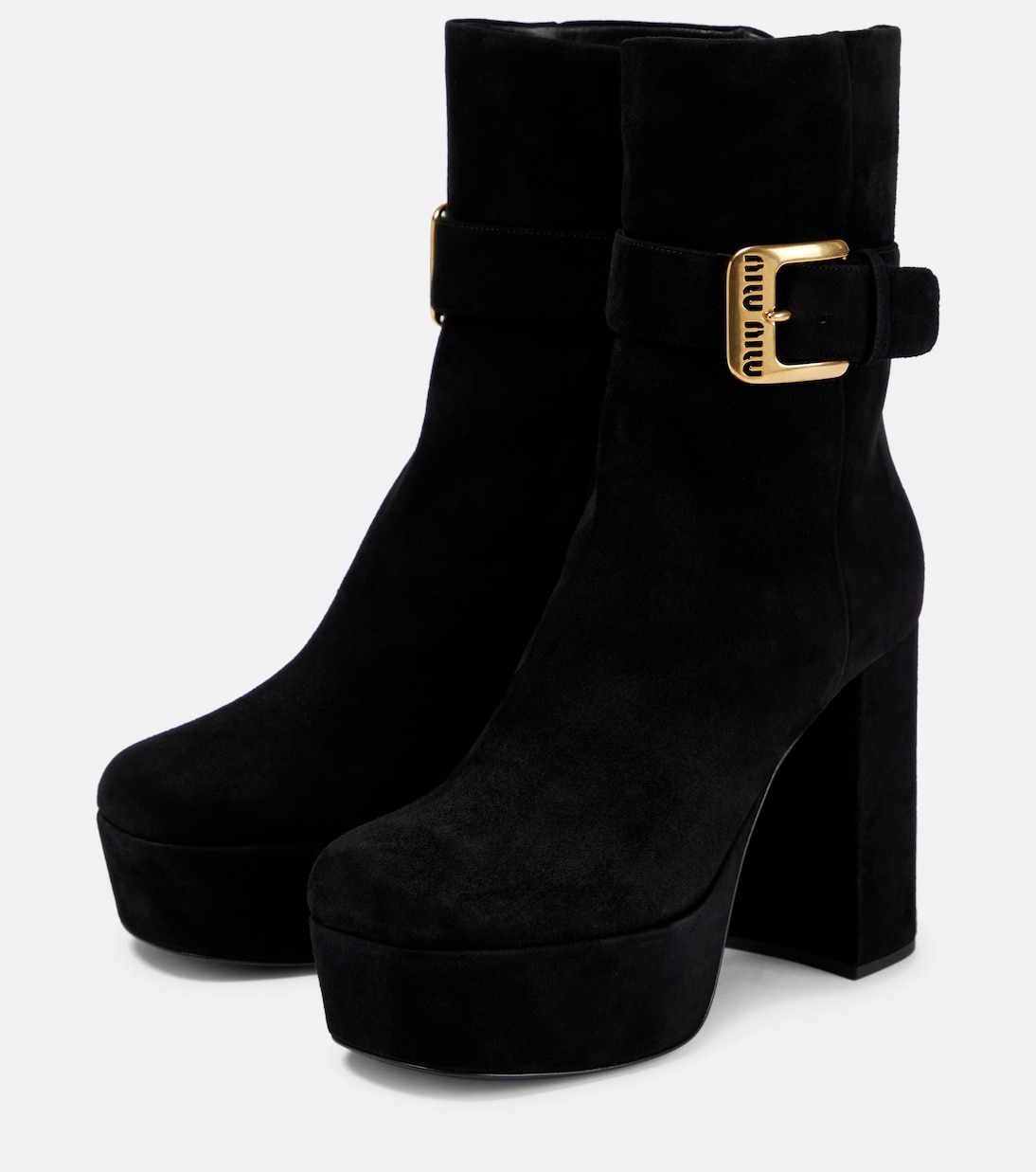 Эти ботильоны на платформе от Miu Miu добавят глубины вашему образу для холодной погоды благодаря полностью замшевому верху. Конструкция с блочным каблуком имеет квадратные носки и ремни на щиколотках, закрепленные золотистой пряжкой.