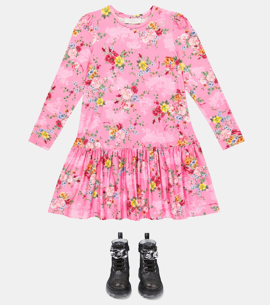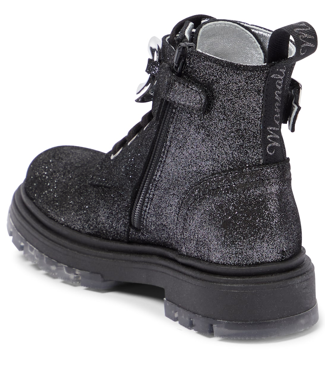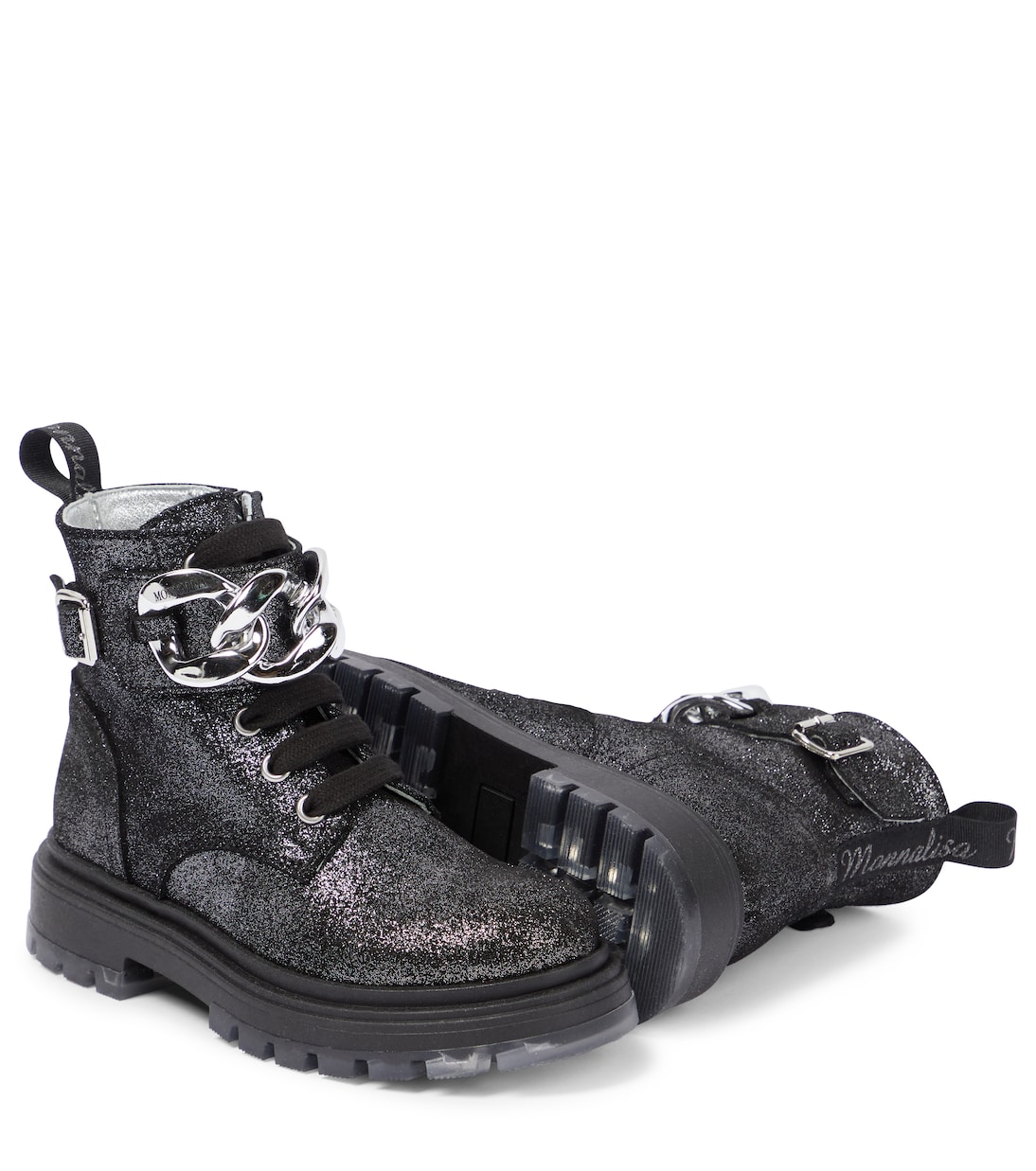 Эти ботильоны от Monnalisa украшены массивной цепочкой, на которой выгравировано название бренда. Они сделаны из кожи, покрытой блестками, и опираются на цепкую резиновую подошву.