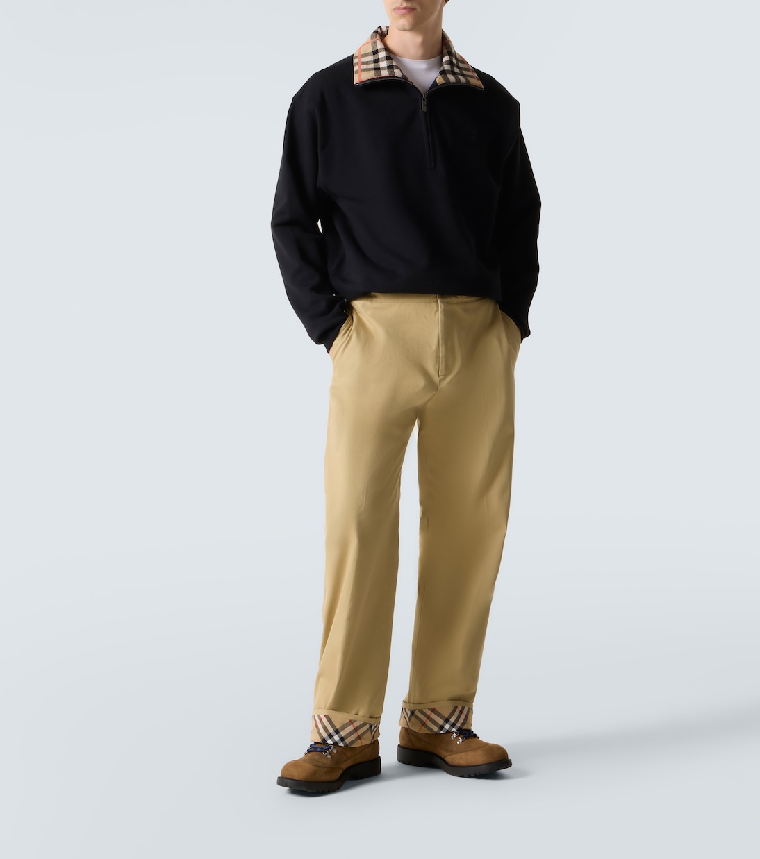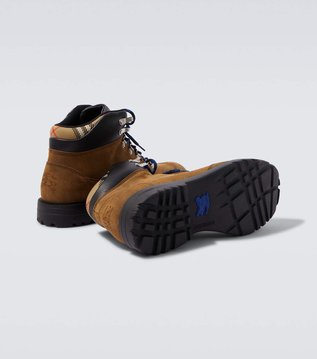 Эти ботинки на шнуровке Burberry украшены культовыми эмблемами бренда, в том числе изображением конного рыцаря на пятках и язычках, а также фирменной клеткой Burberry Check на воротнике. Пара изготовлена из замши и дополнена цветными шнурками.