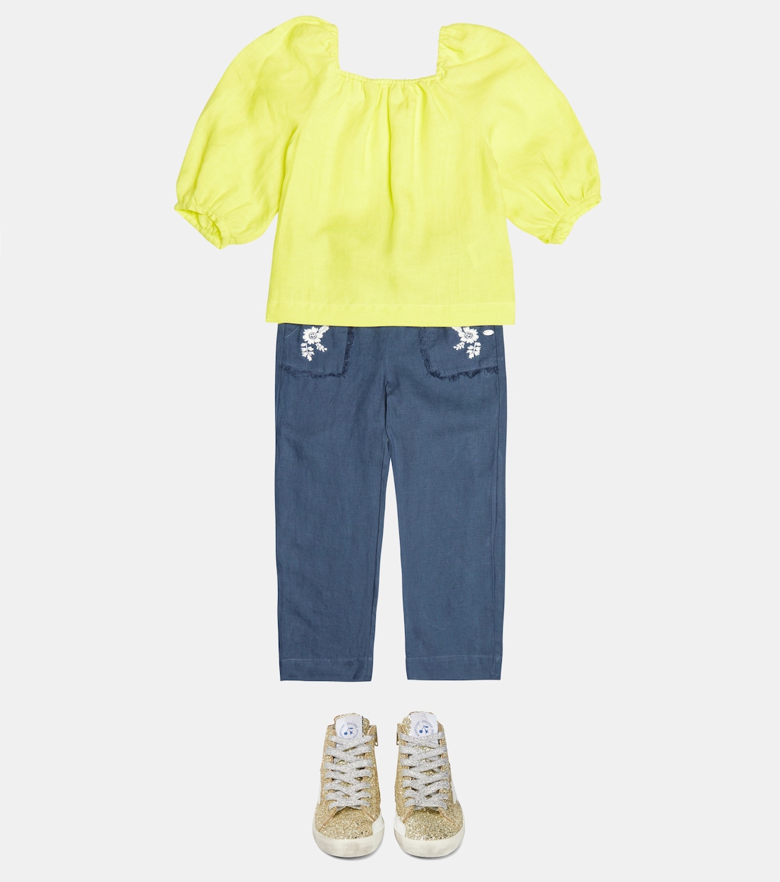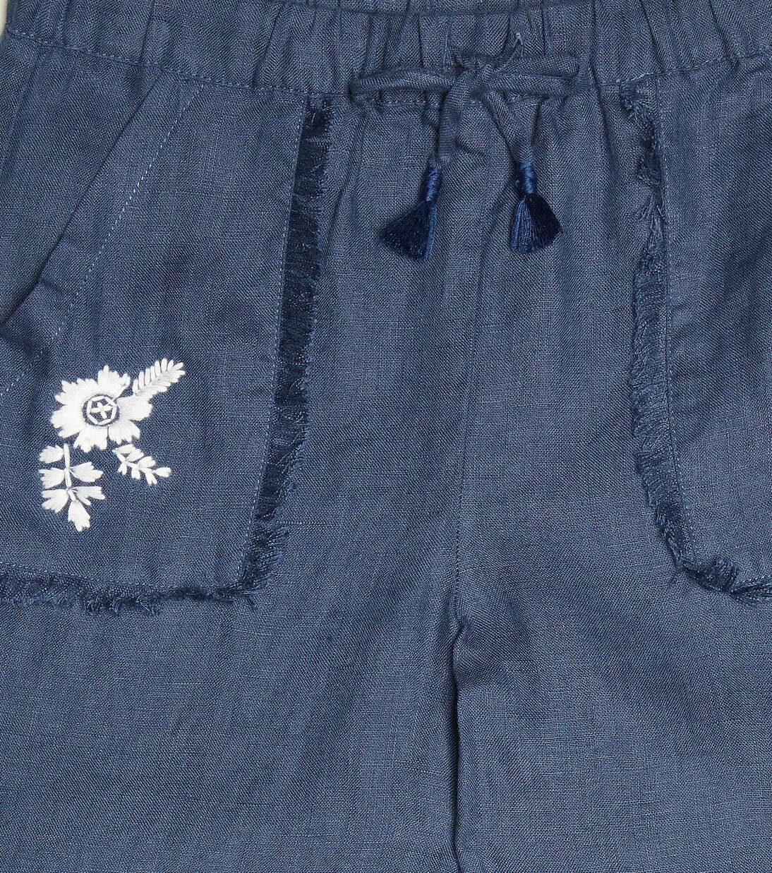 Эти брюки от Tartine et Chocolat украшены очаровательной цветочной вышивкой на накладных карманах с бахромой. Они сшиты из летнего льна и имеют талию на эластичной завязке.