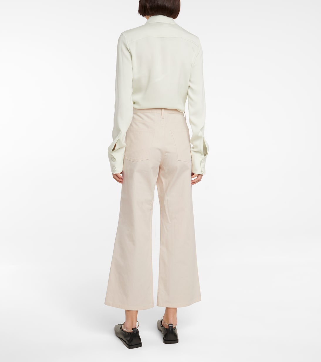 Эти брюки с высокой талией, неподвластные времени, идеально демонстрируют неизменный подход Jil Sander к гардеробу. Они изготовлены из комфортного хлопка и имеют расклешенные штанины от колен и укороченный подол. Классический бежевый оттенок идеально впишется в ваш повседневный гардероб.