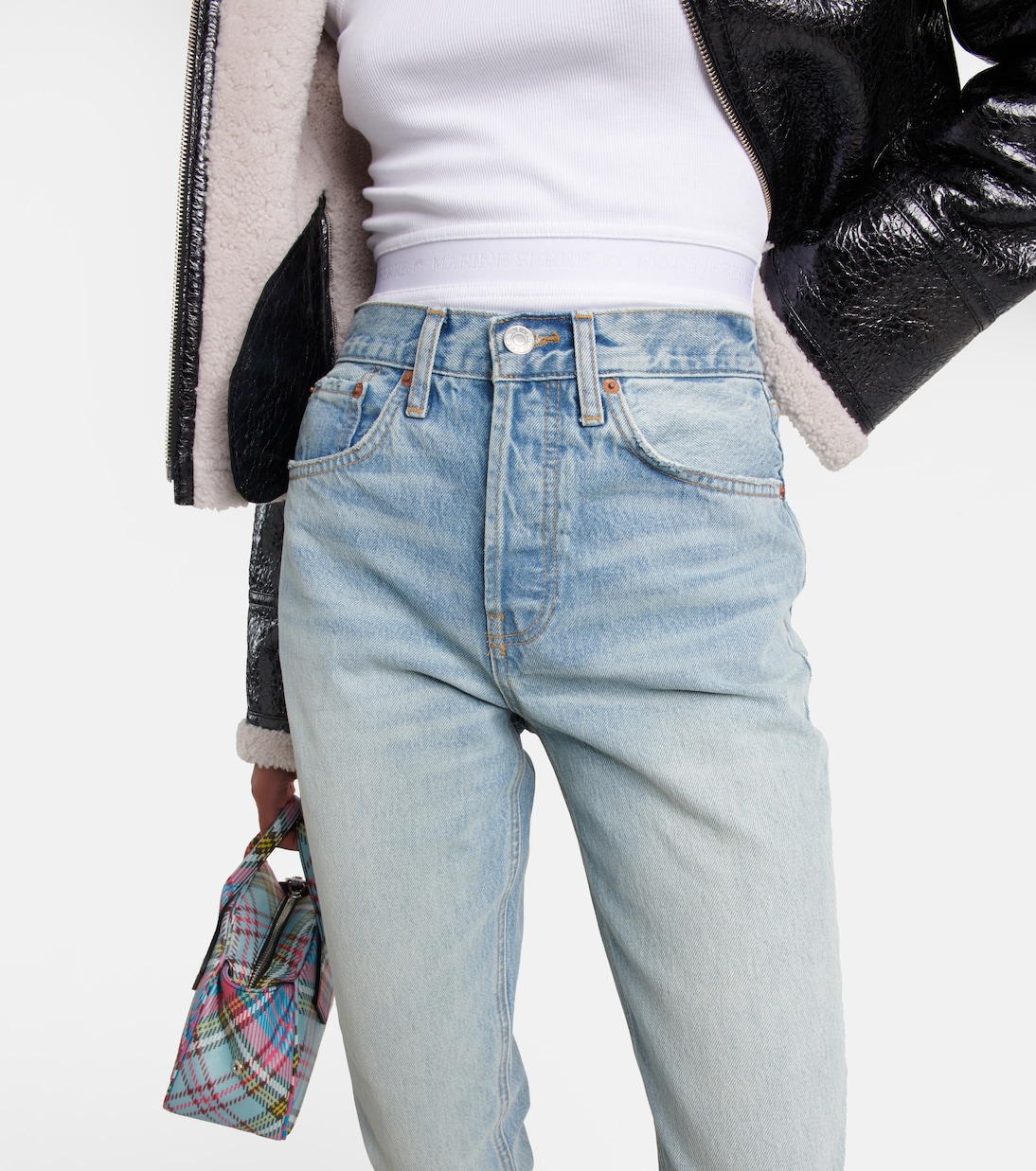 Эти джинсы bootcut с высокой талией от Re/Done были вдохновлены расклешенными силуэтами 70-х годов. Изготовлен из светлого хлопкового денима с потертостями и ворсом, этот приталенный крой дополнен классическими разрезными манжетами.