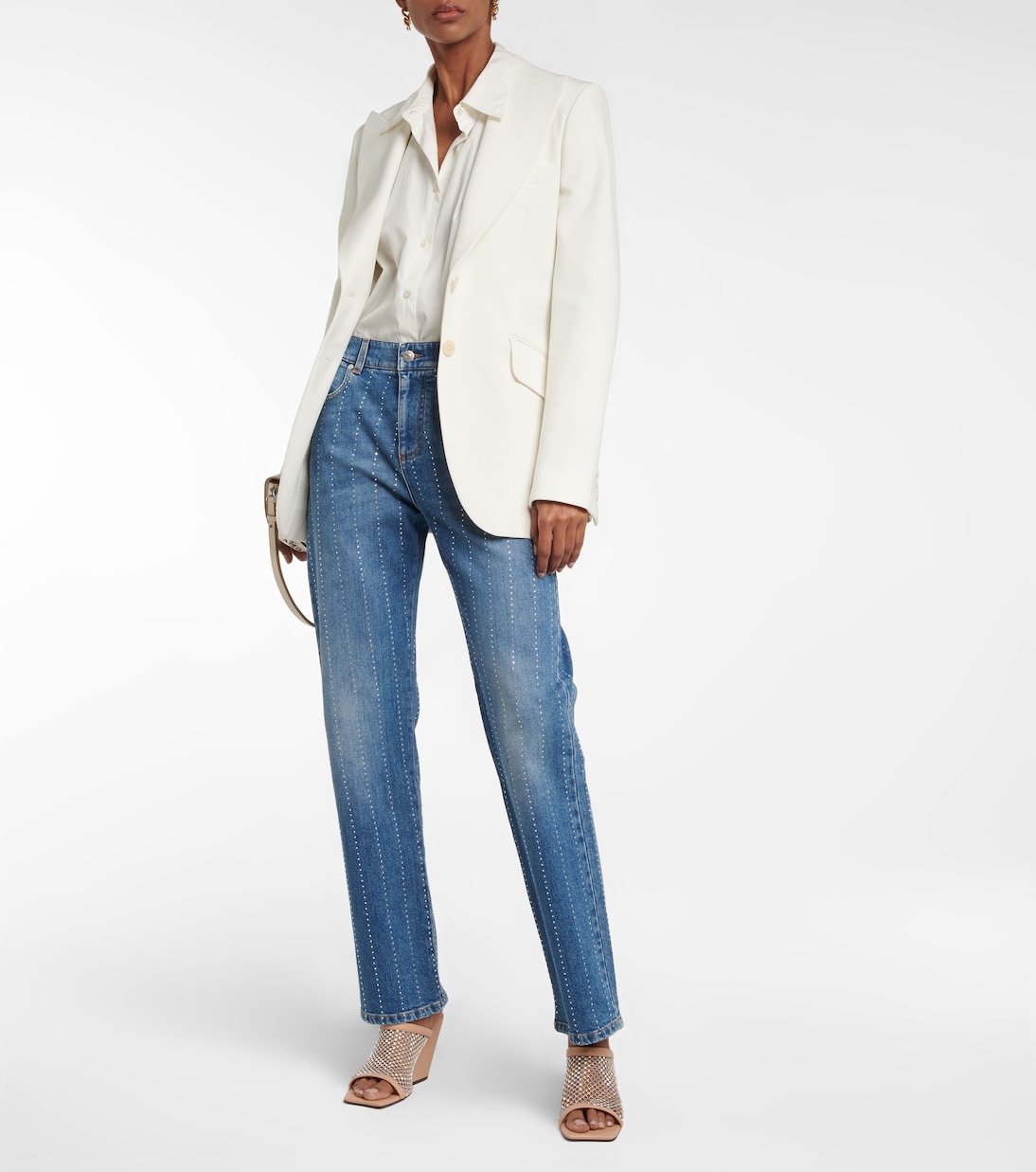 Эти джинсы от Stella McCartney изготовлены в Италии из джинсовой ткани синего цвета средней потертости. Слегка укороченный прямой силуэт, украшенный полосками мерцающих кристаллов.